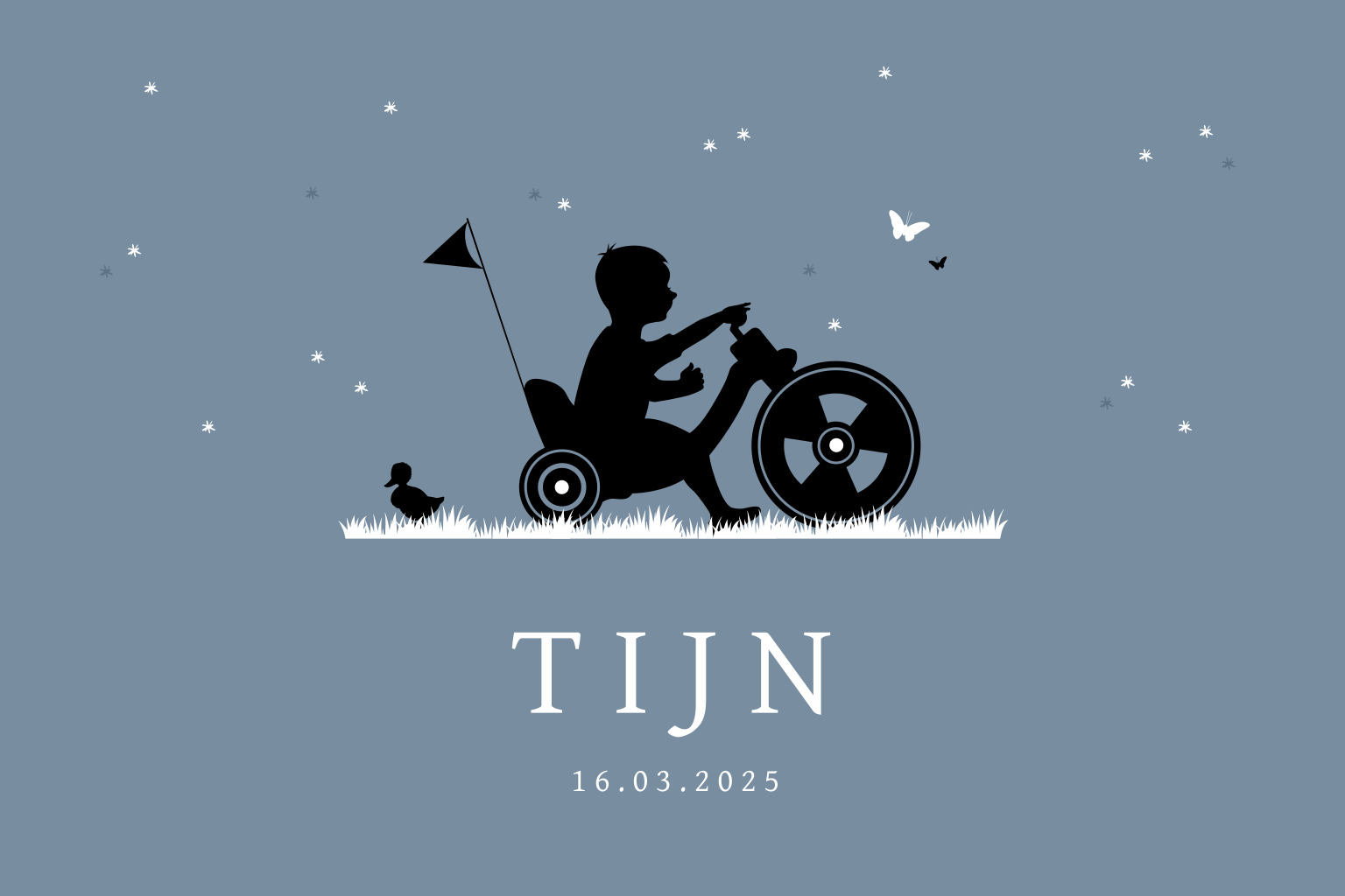 Goudfolie babykaart met silhouet op driewielers met sterren