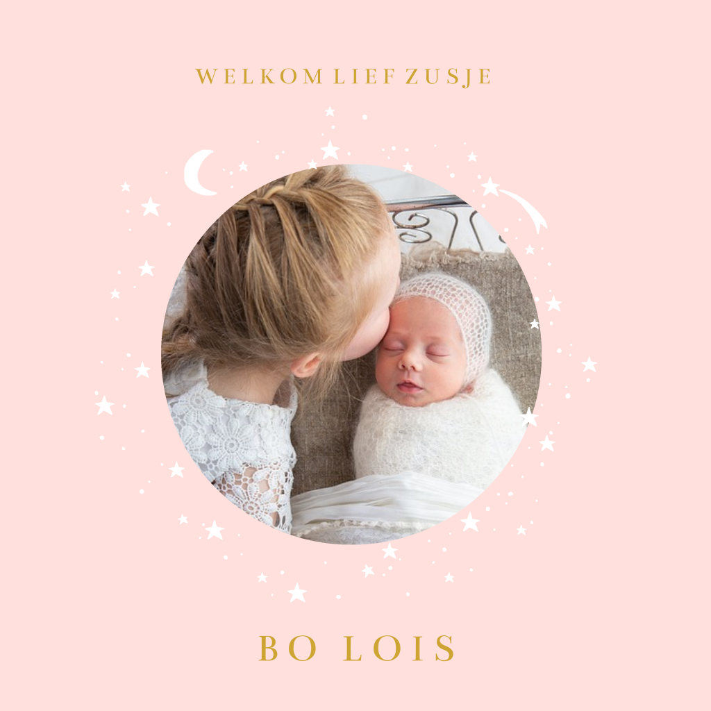 Een lief en hip geboortekaartje voor een zusje, met sterren en maan in goudfolie en ruimte voor eigen foto. Alle kleuren zijn aanpasbaar. Vervang ook de foto en pas de teksten aan.