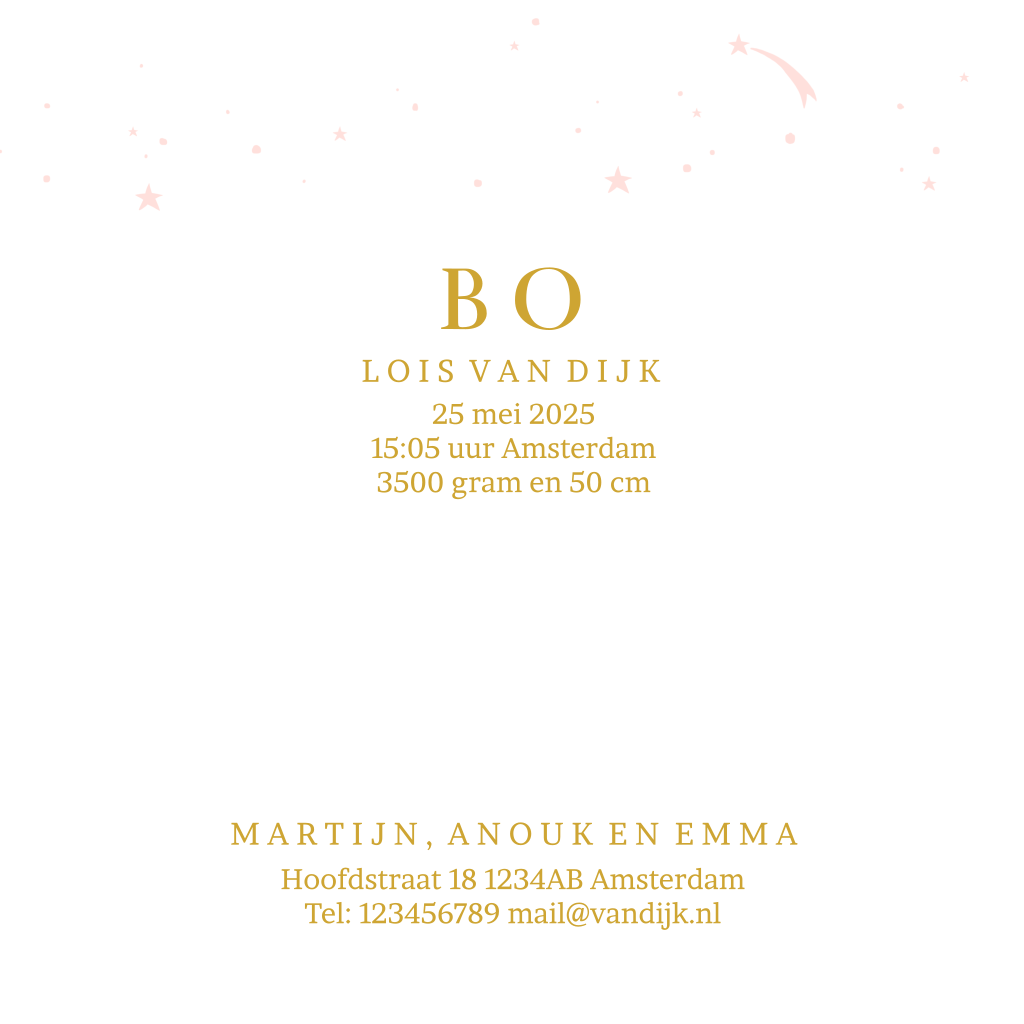 Goudfolie geboortekaartje met foto in rond, sterren en maan