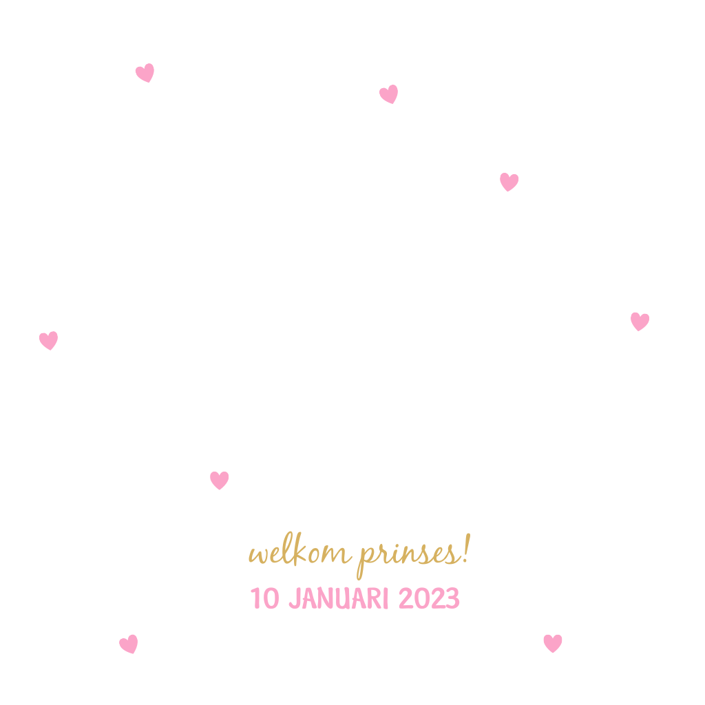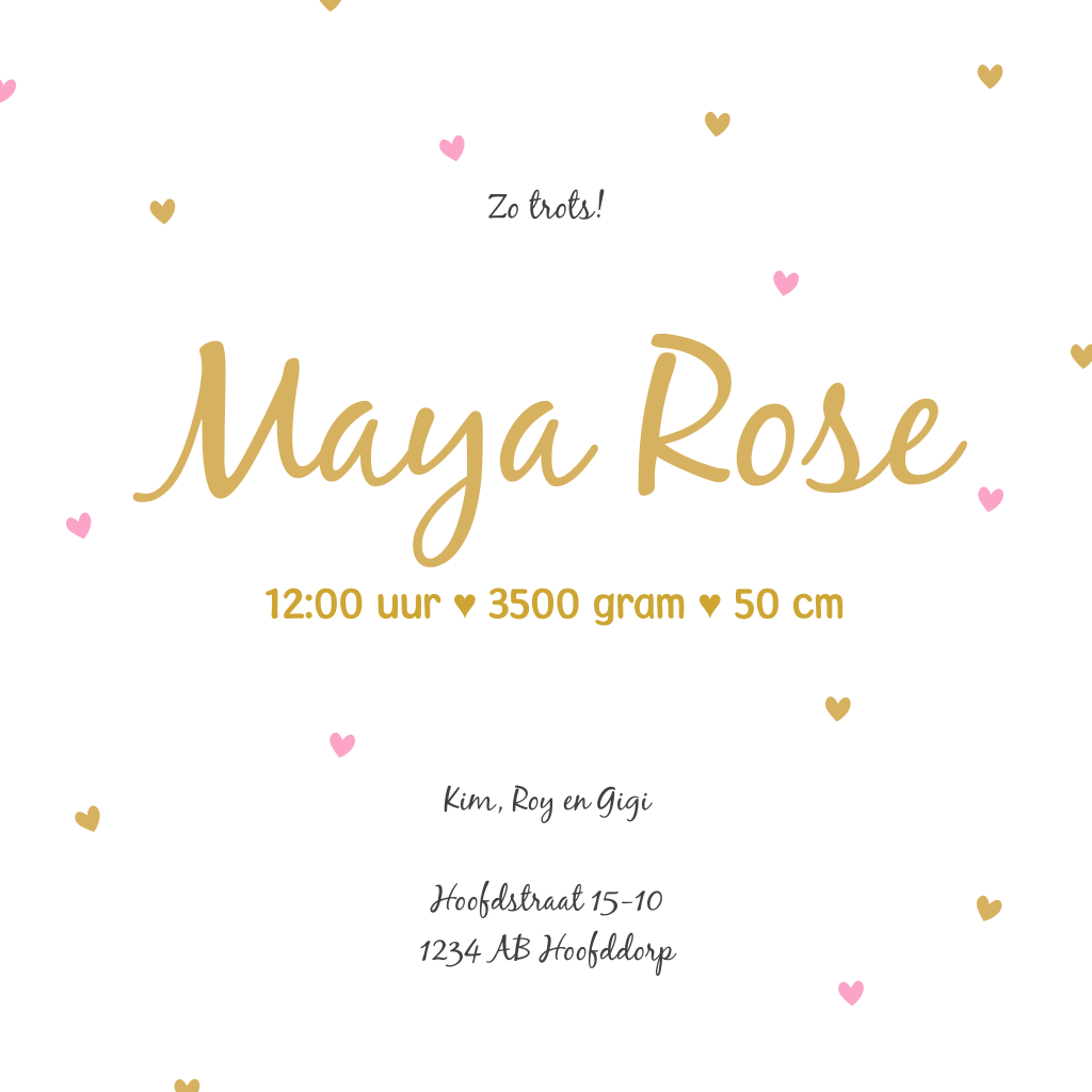 Lief geboortekaartje met hip goud. De hartjes en de meisjesnaam worden in goudfolie gedrukt. Heb je ook het schattige hartje op de achterkant gezien? Let op: Deze kaart heeft een langere verzendtijd: voor 18.00 uur besteld = de volgende werkdag gedrukt en verzonden.