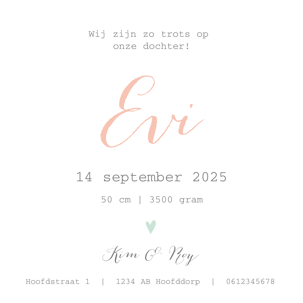 Hip geboortekaartje voor je pasgeboren dochtertje met roze hartjes en sterretjes. De babynaam springt er echt uit omdat deze met goudfolie wordt gedrukt. Liever een andere achtergrondkleur? Je kunt het eenvoudig aanpassen in de online editor!