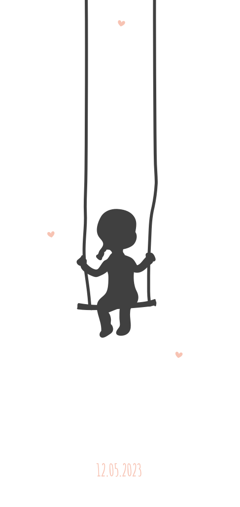 Hip geboortekaartje met silhouet van meisje op een schommel. 2 hartjes en de naam worden met goudfolie gedrukt.Wist je dat we ook een bijpassend kraamborrelkaartje hebben? Let op: Deze kaart heeft een langere verzendtijd: voor 18.00 uur besteld = de volgende werkdag gedrukt en verzonden.