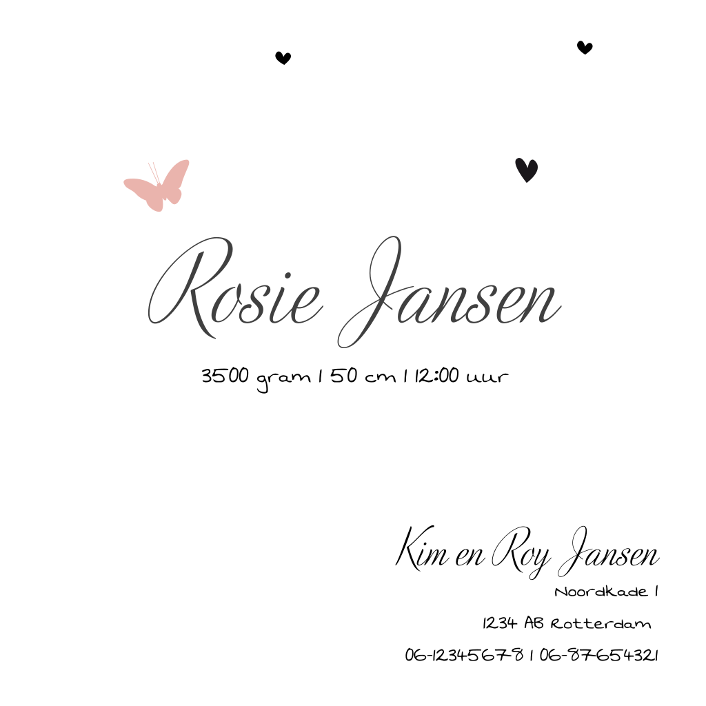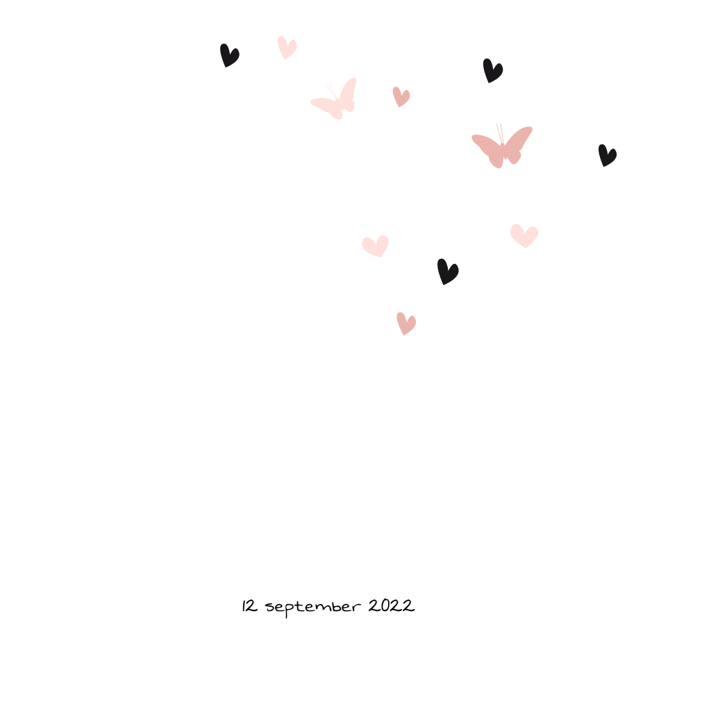 Schattig geboortekaartje voor je dochtertje met lieve roze vlindertjes die omhoog fladderen. De naam van de baby en een paar vlindertjes worden in goudfolie gedrukt en maken dit een heel speciaal geboortekaartje! Plaats een mooie foto van de kleine lieve meid in de binnenkant en kies een mooie gekleurde envelop!