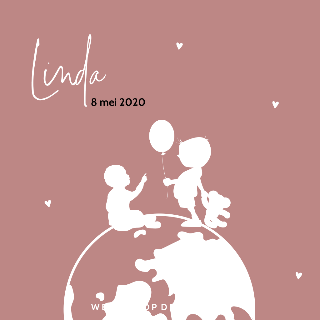 Hip geboortekaartje met goudfolie silhouetjes van een grote broer met zijn baby-zusje op een wereldbol. Er staan lieve hartjes omheen!