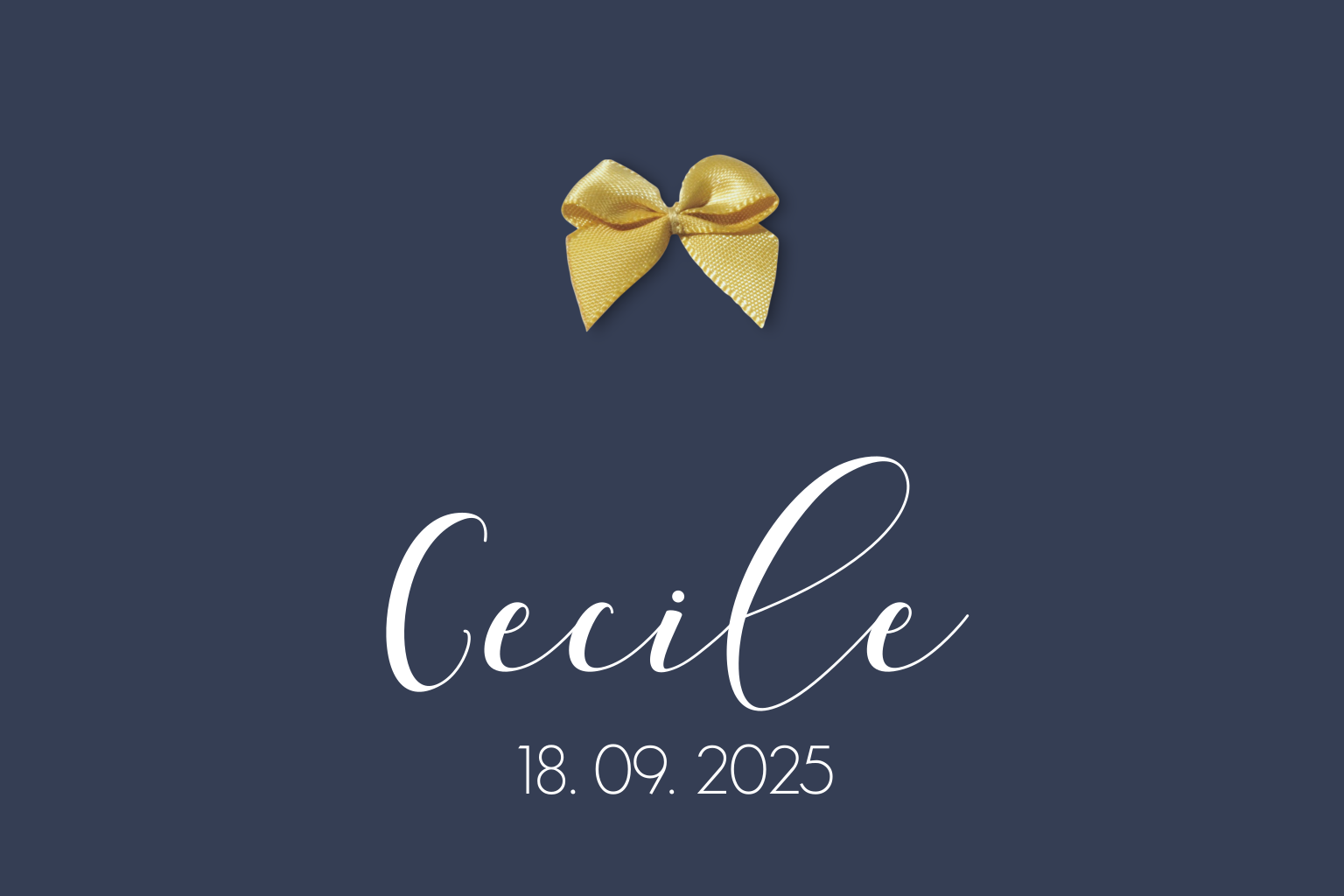 Hip geboortekaartje met gouden strikje en goudfolie letters.