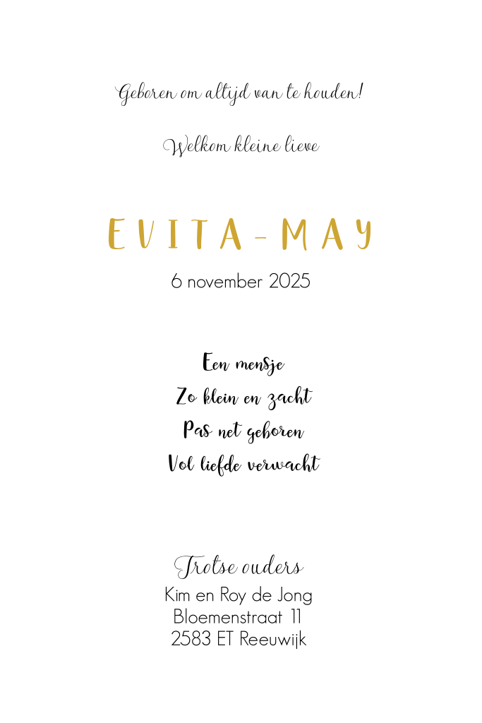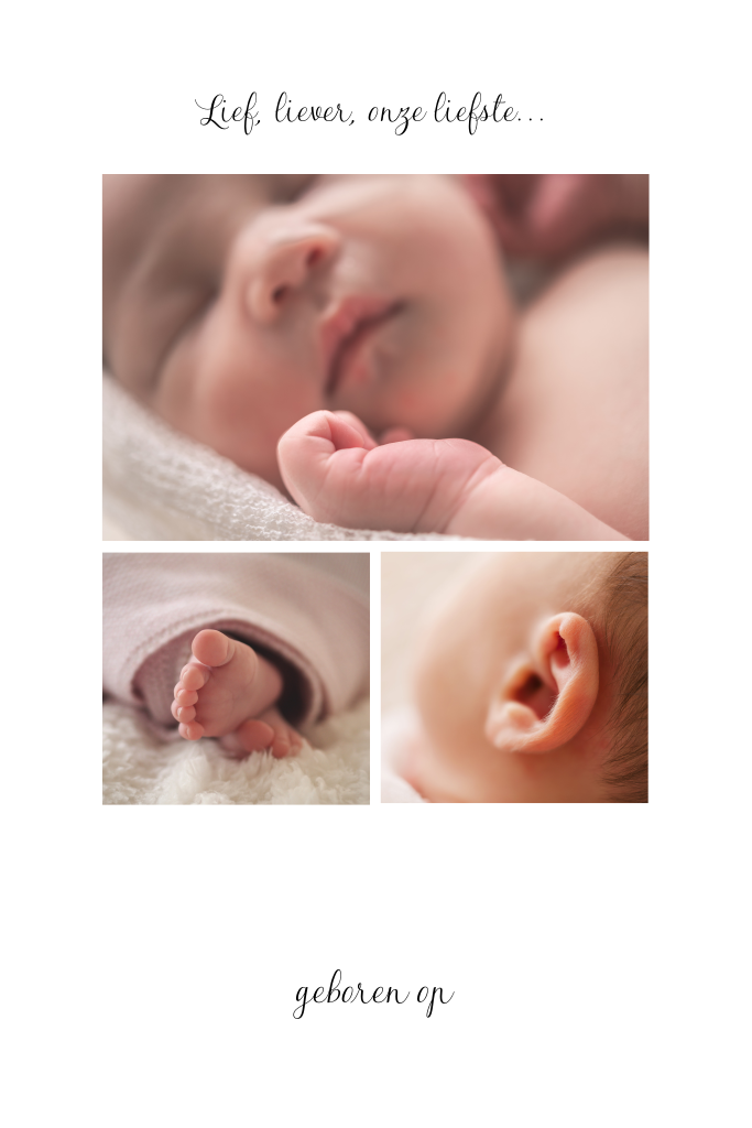 Klassiek geboortekaartje met goudfolie en drieluik met foto's