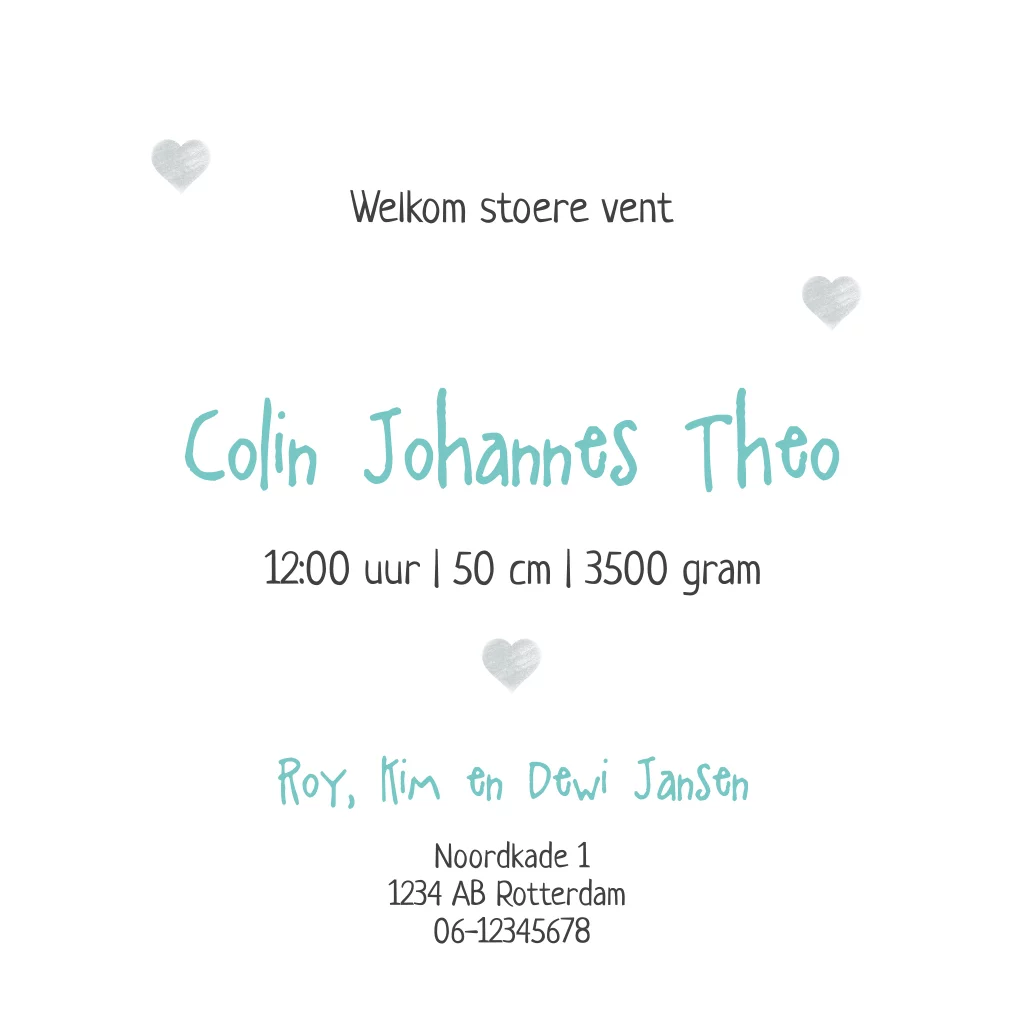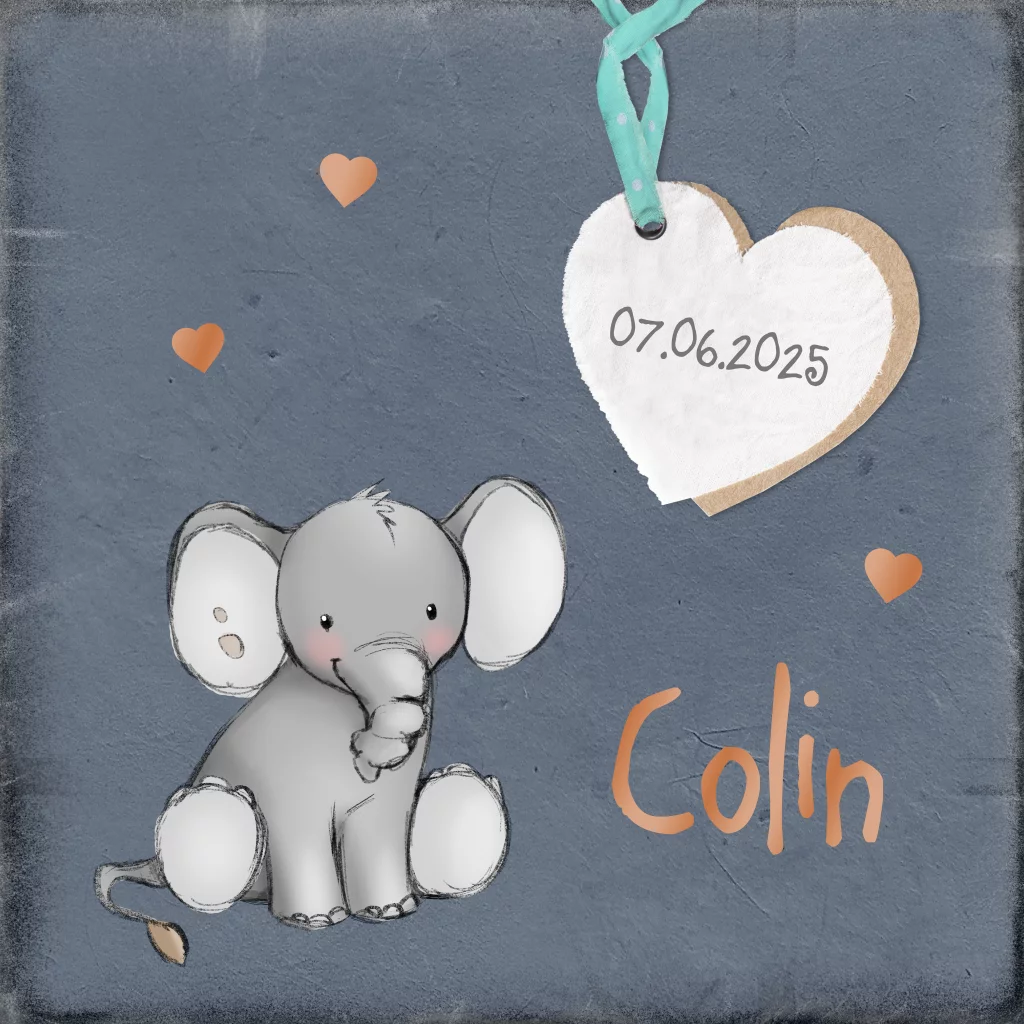 Stoer geboortekaartje met lief olifantje met hartjeslabel en hartjes in hoogglans. De naam van je jongen wordt ook in hoogglans gedrukt. Let op: Deze kaart heeft een langere verzendtijd: voor 18.00 uur besteld = de volgende werkdag gedrukt en verzonden.