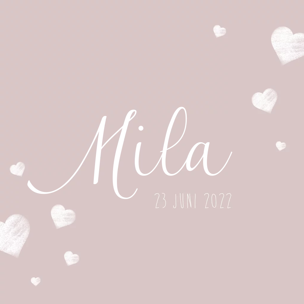 Ben je opzoek naar een hip geboortekaartje om de geboorte van je dochtertje aan te kondigen? Dan is dit lieve roségoudfolie geboortekaartje echt wat voor jou! Met witte romantische hartjes op een oud roze achtergrond en de babynaam in roségoudfolie is dit een uniek geboortekaartje!