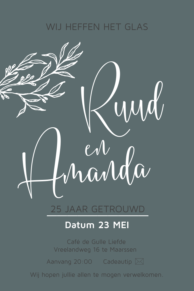 Stijlvolle uitnodiging 25 jaar getrouwd met goudfolie takje op grijs