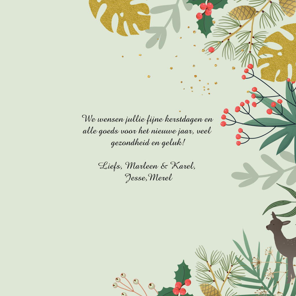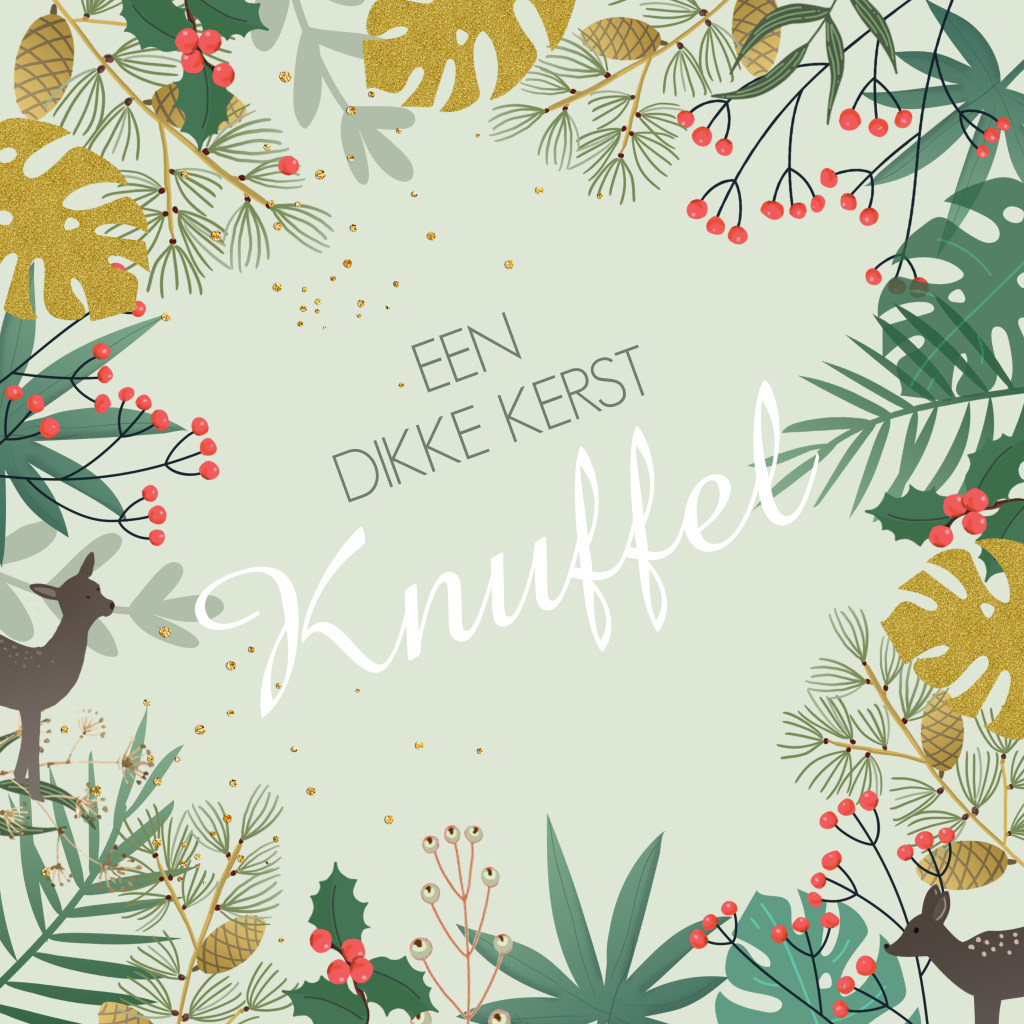 Een vierkante getekende goudfolie kerstkaart. De kaart heeft een design met verschillende takjes en hertjes. Tekst op de voorkant kan in goudfolie worden gedrukt.