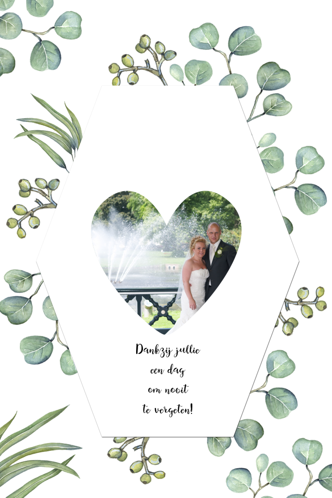 Hippe bedankkaart met eucalyptusblad en ruimte voor jullie eigen foto! De kader en de tekst kunnen in echte goudfolie gedrukt worden. Iets voor jullie?