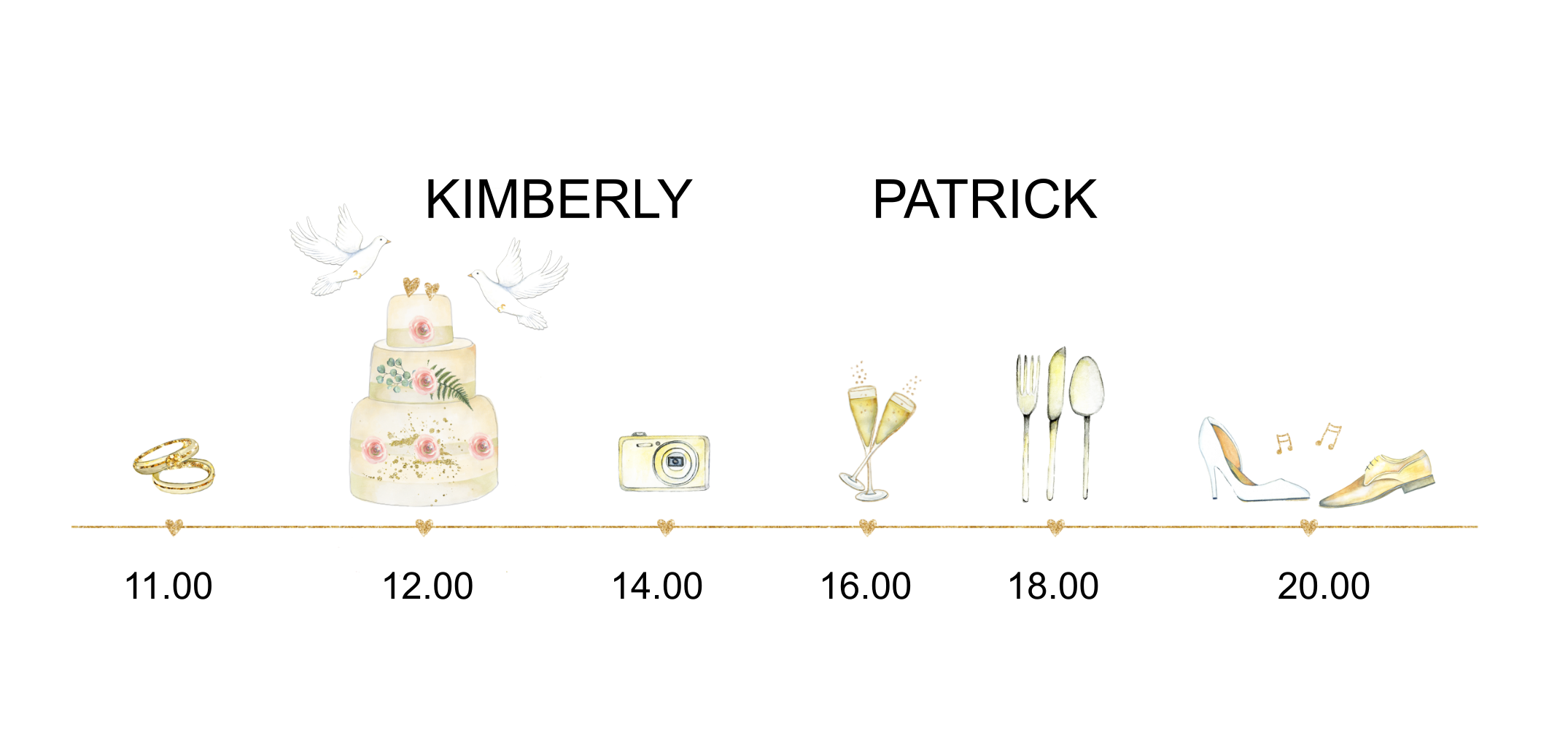 Goudfolie trouwkaart met tijdlijn in een panorama formaat