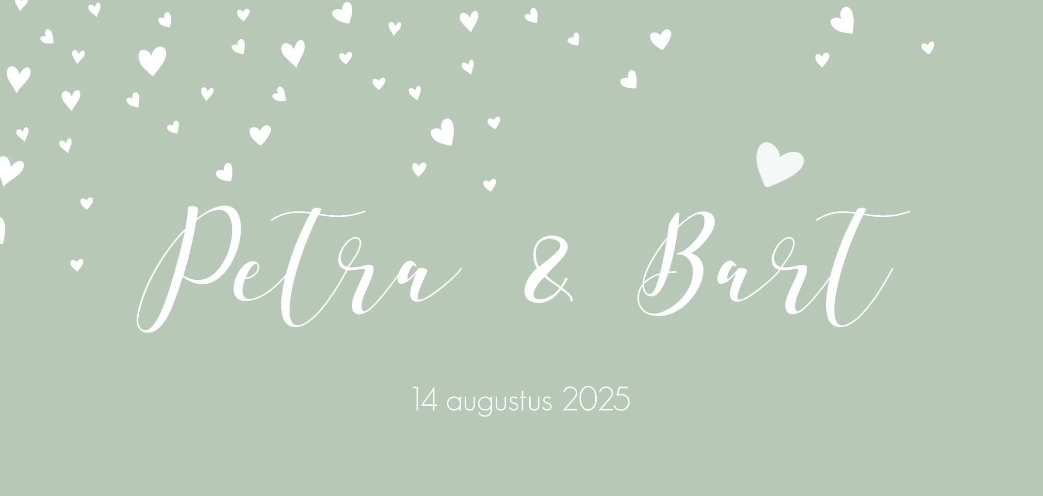 Op deze romantische trouwkaart zijn jullie namen en het hartje in goudfolie gedrukt. Je kunt de lettertypes wijzigen en zelfs alle hartjes in goudfolie plaatsen. Let op: Deze kaart heeft een langere verzendtijd: voor 18.00 uur besteld = de volgende werkdag gedrukt en verzonden.