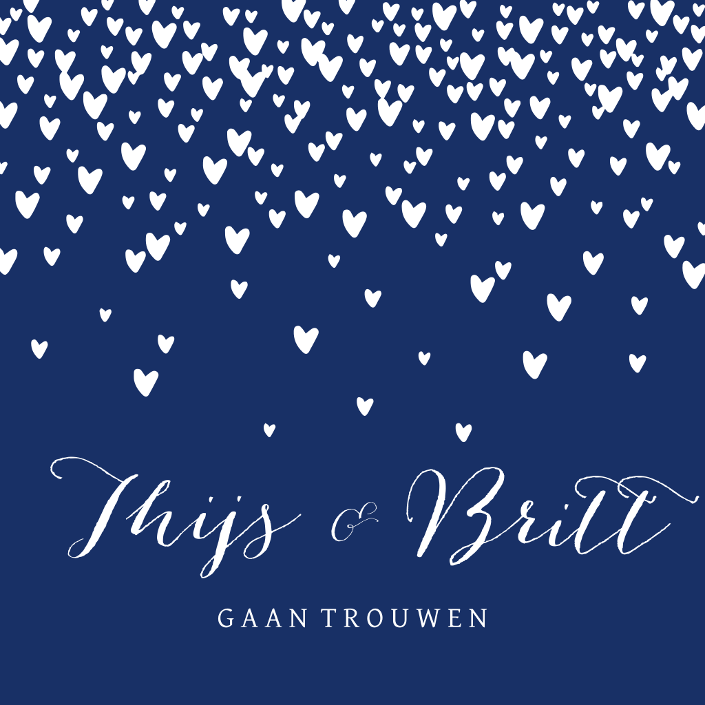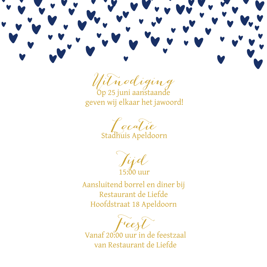 Een mooie, stijlvolle trouwkaart met goudfolie hartjes. Alle kleuren zijn aanpasbaar. Pas ook de teksten aan. Bekijk ook onze bijpassende menukaart.