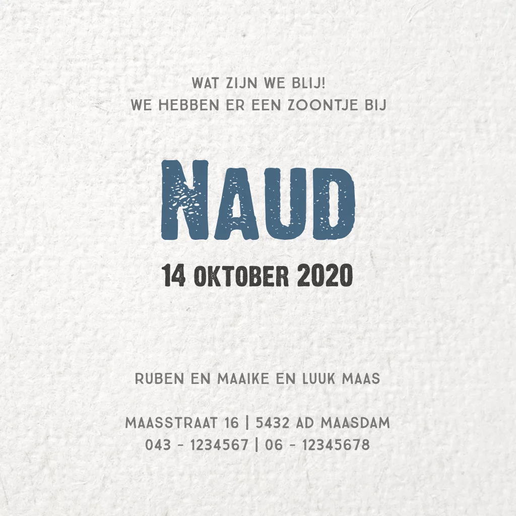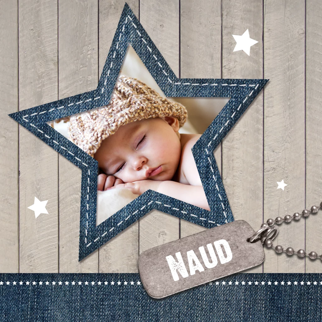 Wil je een geboortekaartje voor je zoon die lekker stoer is? Deze geboortekaart heeft alle elementen die daar aan meewerken: een stoere naamtag, een ster van jeansstof en een steigerhout achtergrond met sterretjes.