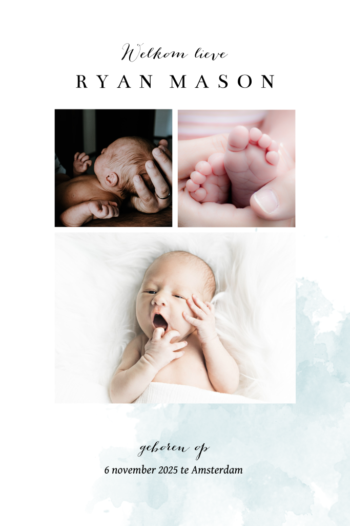 Een stijlvolle fotokaart van Poobies met blauwgroene watercolour en 3 fotokaders. Leuk voor de geboorte van een zoontje! Combineer hem met een bijpassende envelop met sluitzegel en stuur hem op.