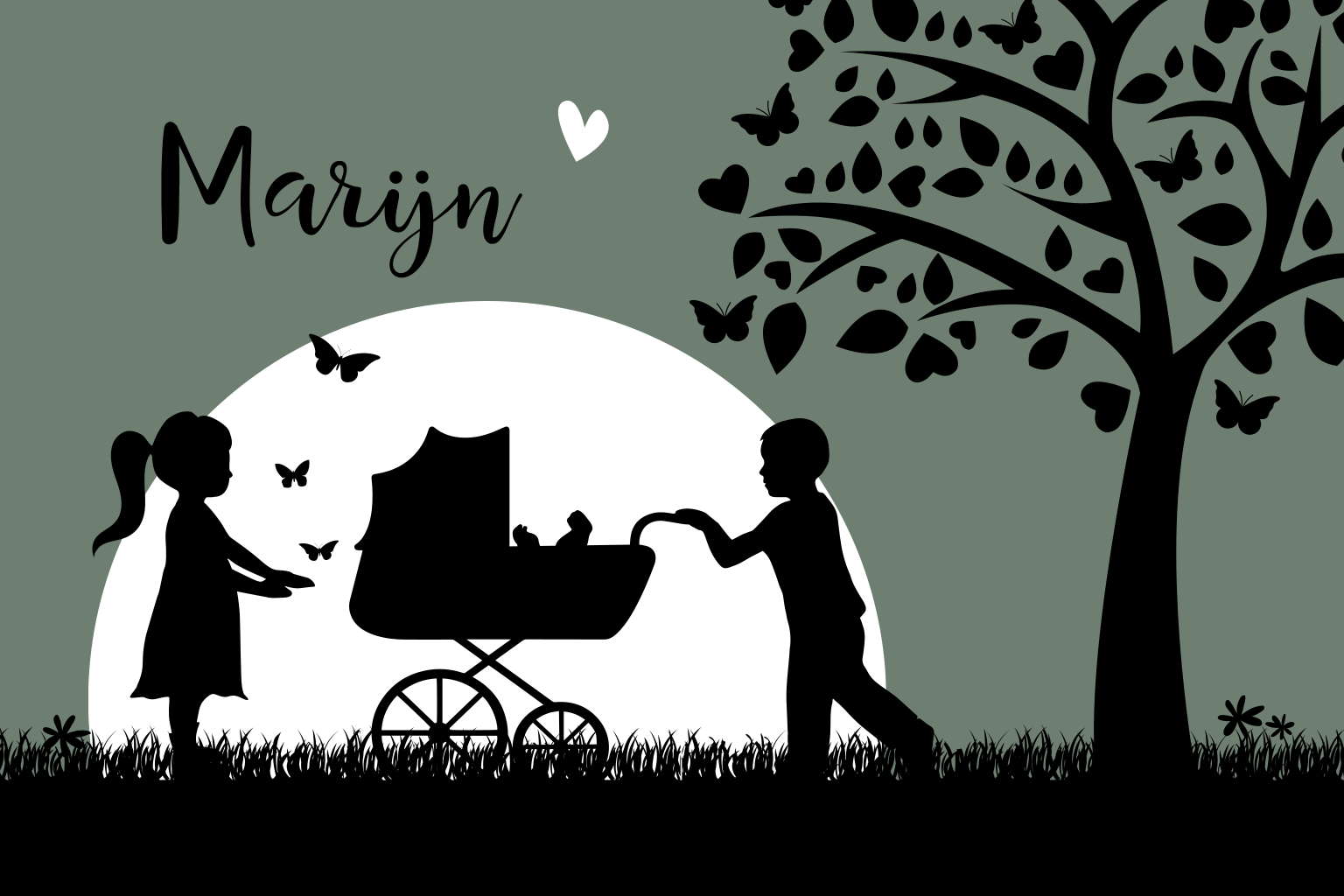 Twee kindjes bij zonsondergang met een kinderwagen omringt door vogels en een boom met vlinders: wat romantisch! Dit hippe silhouet-geboortekaartje is leuk als geboorte-aankondiging van een zoontje. Kleuren en lettertypes kunnen naar wens worden aangepast.