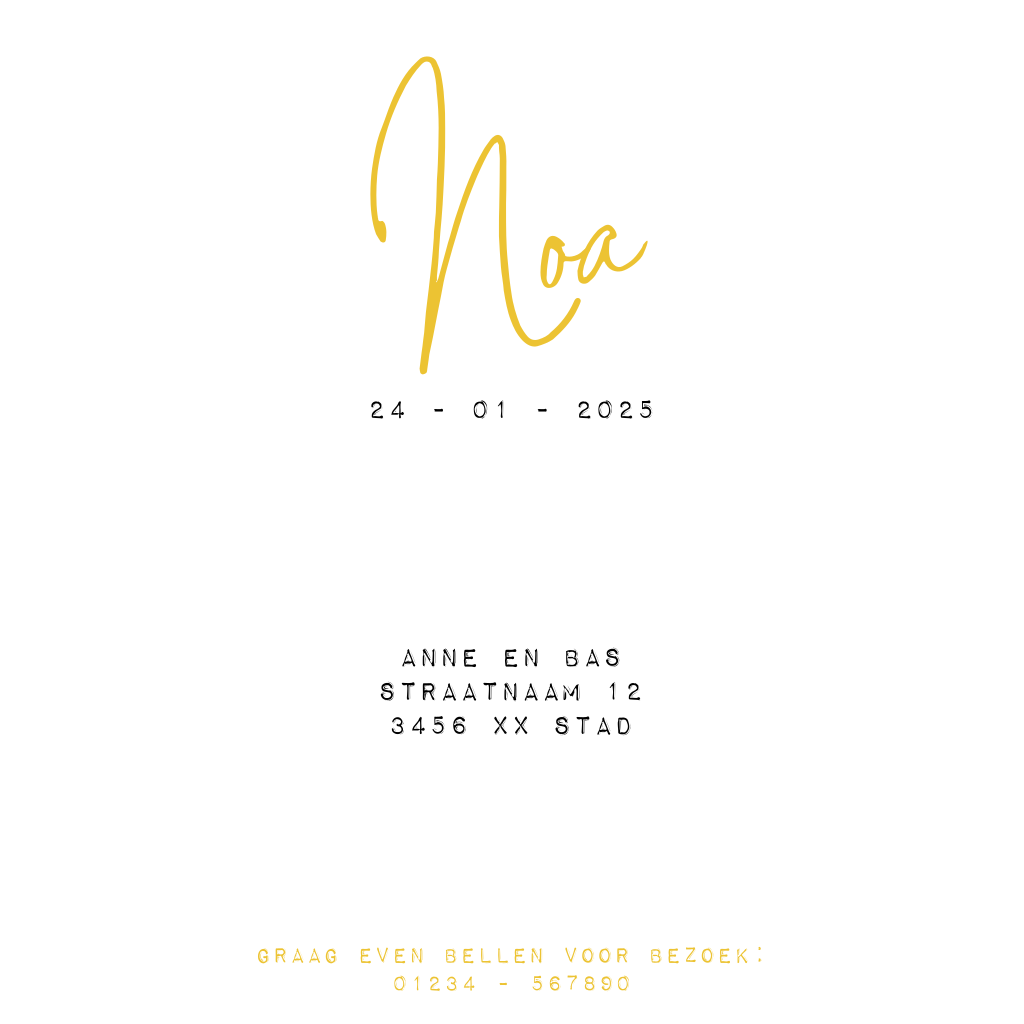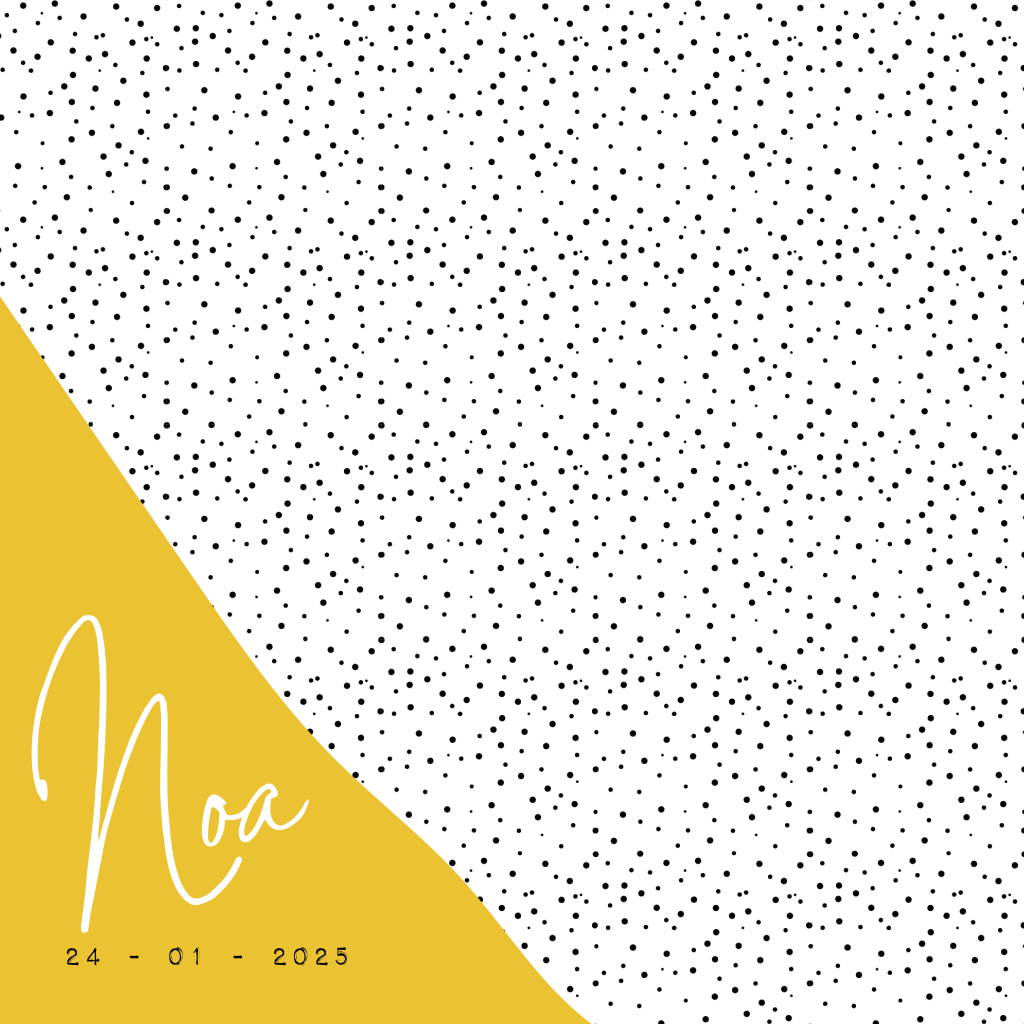 Een modern geboortekaartje met stippen en een hip, okergeel vlak. Leuk voor een jongen! Teksten en lettertypes kun je naar wens aanpassen.