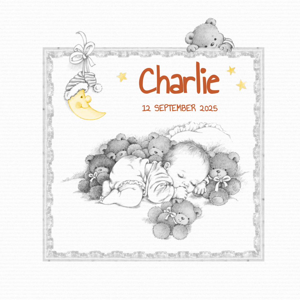 Getekend geboortekaartje met slapend kindje en knuffelberen