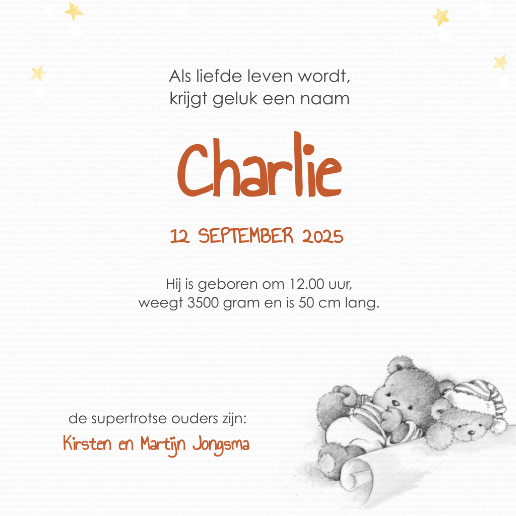Wat een ontzettend schattig geboortekaartje voor een jongen! Dit getekende kaartje met een slapend kindje en zijn knuffelberen is extra versierd met een lief maantje met slaapmuts en gele sterretjes. Vul de naam in van jouw slapende schoonheid en maak dit kaartje helemaal af.