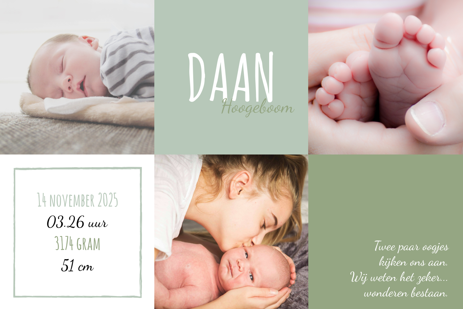 Wil je ook graag een fotokaartje versturen voor de geboorte van je zoontje? Misschien is dit hippe geboortekaartje iets voor jou! Voeg verschillende mooie foto's toe en schrijf alle geboortegegevens in de groene blokken.