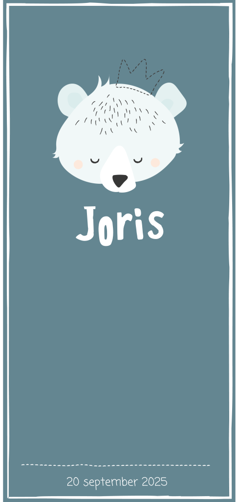 Een langwerpig geboortekaartje met een wit kader en een lief beertje op een achtergrond in petrol. Het hippe lettertype combineert hier mooi bij. Leuk voor een jongen!