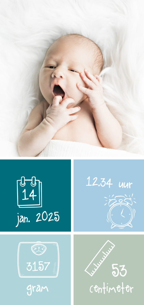 Wat een lieve, langwerpige geboortekaart voor een zoontje! Speciaal zijn de vier leuke vlakken in groen-blauw met icoontjes. Maak hem compleet met eigen teksten en een leuke foto!