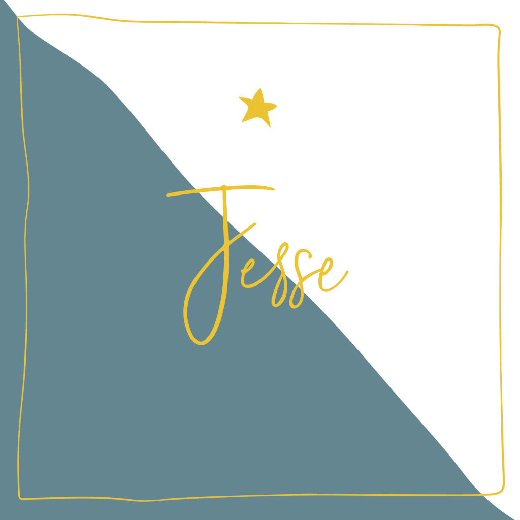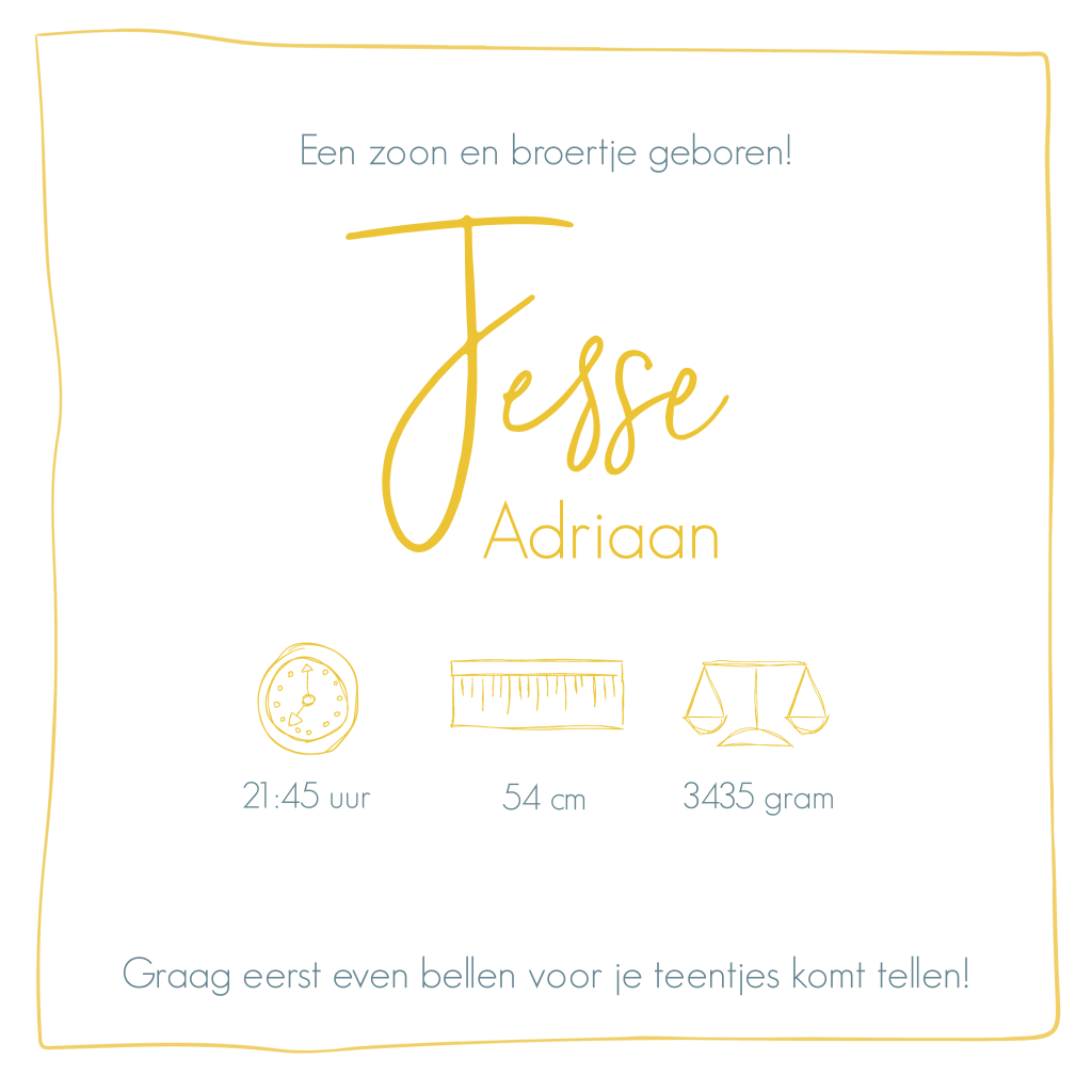 Hippe geboortekaart voor een jongen met twee kleurvlakken en een gele rand. Ook tof is de ster en het bijpassende lettertype. Aan de binnenkant kun je een tekstje of kort gedicht zetten. Maak hem zelf helemaal af!