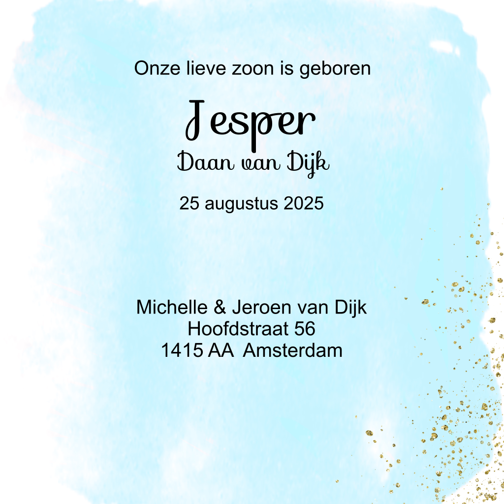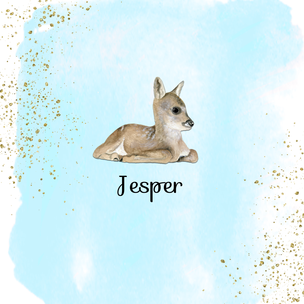 Wat een lief en trendy geboortekaartje met een babyblauwe achtergrond, hertje en feestelijke verfspatters in goudlook! Leuk voor de geboorte van een zoontje. Met een bijpassende envelop en sluitzegel maak jij hem af!