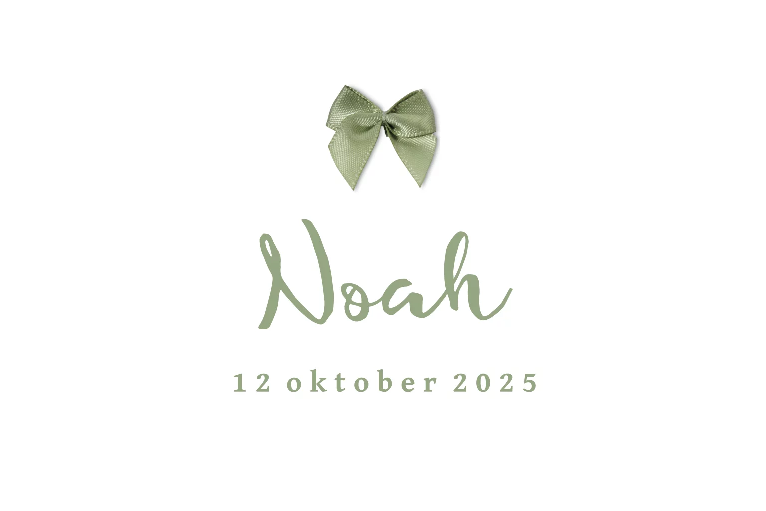 Hip geboortekaartje voor je zoontje met simpel ontwerp. Verander de kleuren, teksten en lettertypes en maak zo je eigen kaartje. Het olijf groene strikje maakt dit kaartje extra speciaal.