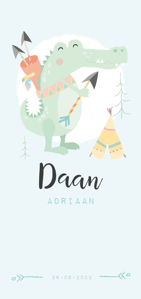 Een trendy geboortekaartje met een avontuurlijke krokodil met pijlen en een tipitent. Ook leuk zijn de groene pijltjes onderaan de kaart waar de geboortedatum tussen staat. Voor een kleine avonturier!