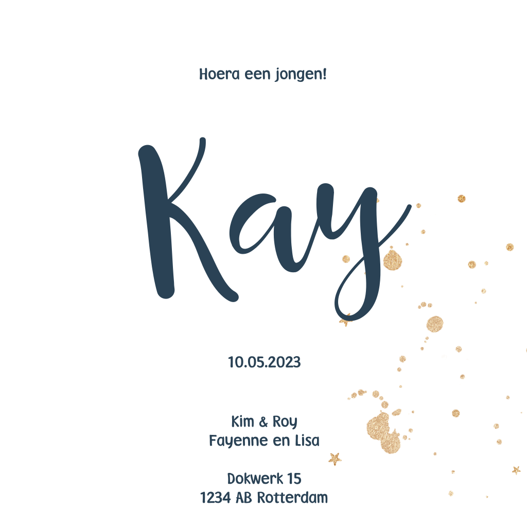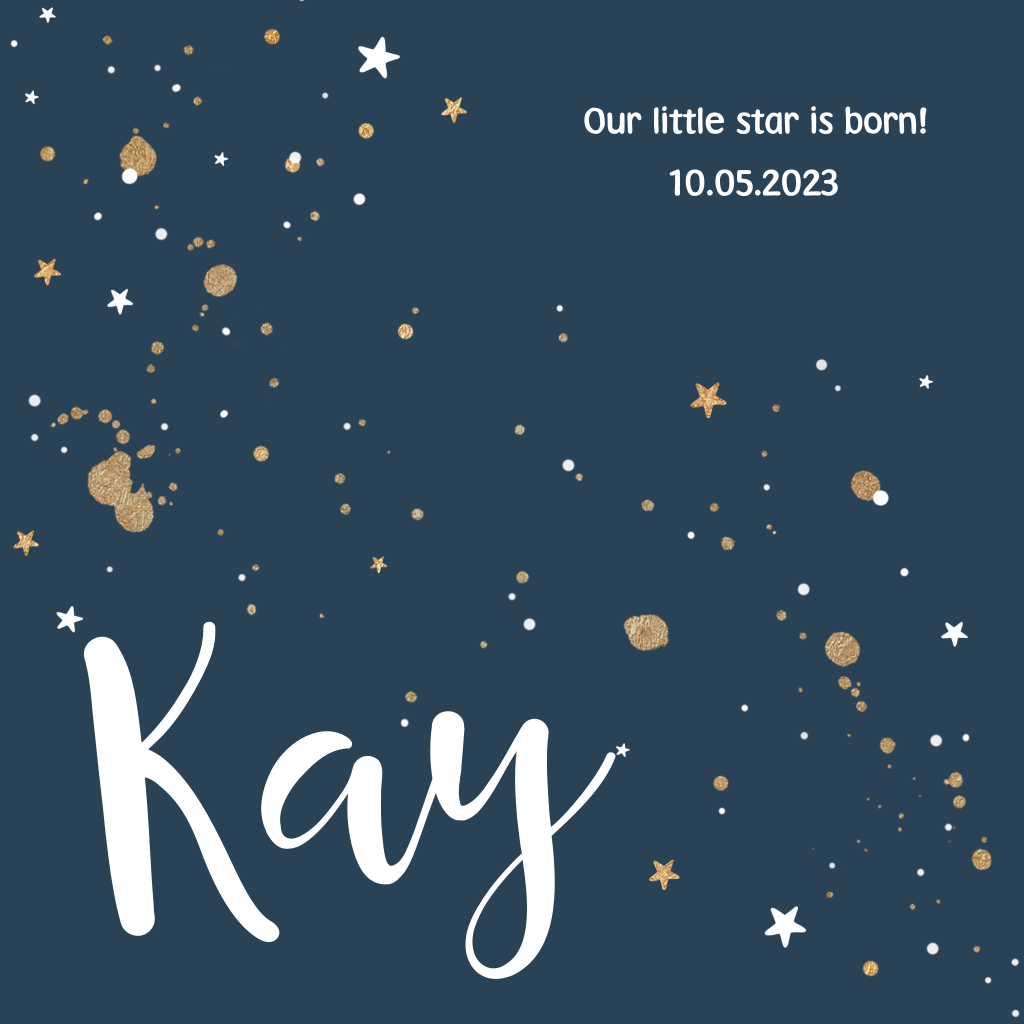 Een stoer en hip babykaartje in donkerblauw met sterren en spetters in goudlook. Leuk voor een jongen! Pas eenvoudig de kleuren en de lettertypes aan en maak er een uniek geboortekaartje van voor jouw kleintje.
