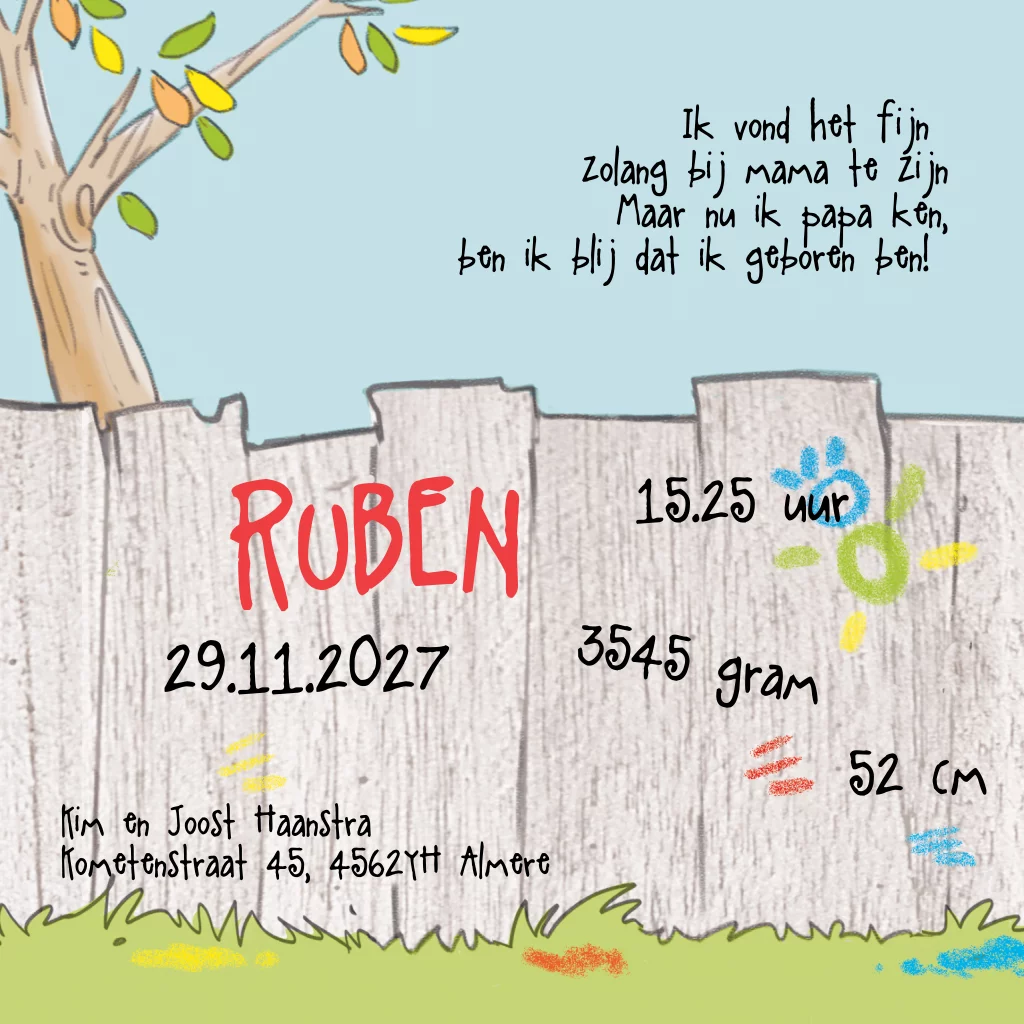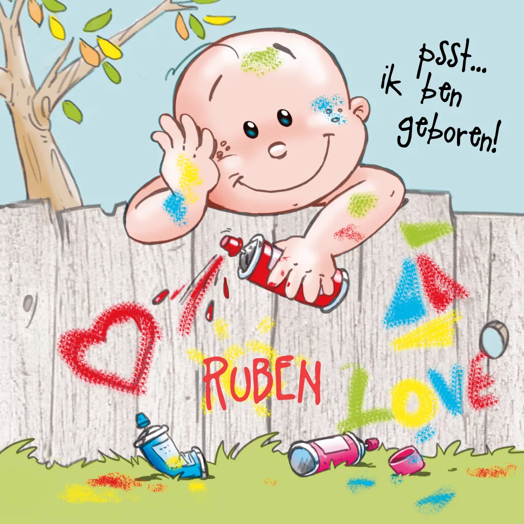 Grappige cartoon geboortekaart voor een jongen! Op de kaart staat een leuke illustratie van een baby boef met potjes verf. In de editor kan de tekst aangepast worden.