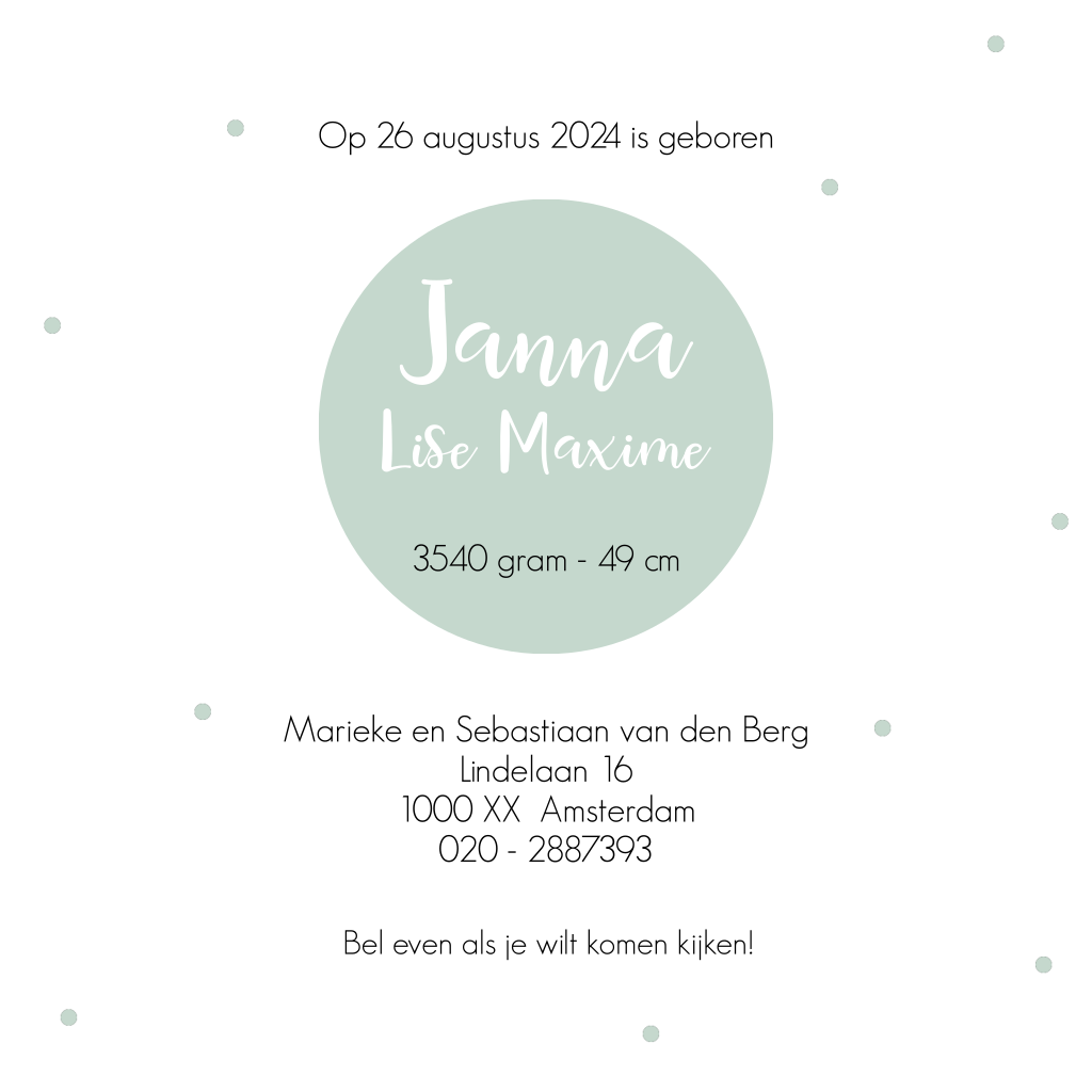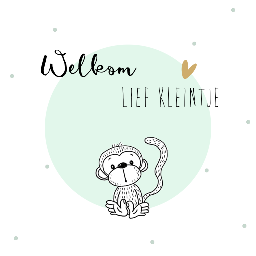 Lief babykaartje met de illustratie van een aapje in zwart wit op een mintgroene cirkel. De tekst en de kleuren kunnen in de editor aangepast worden.