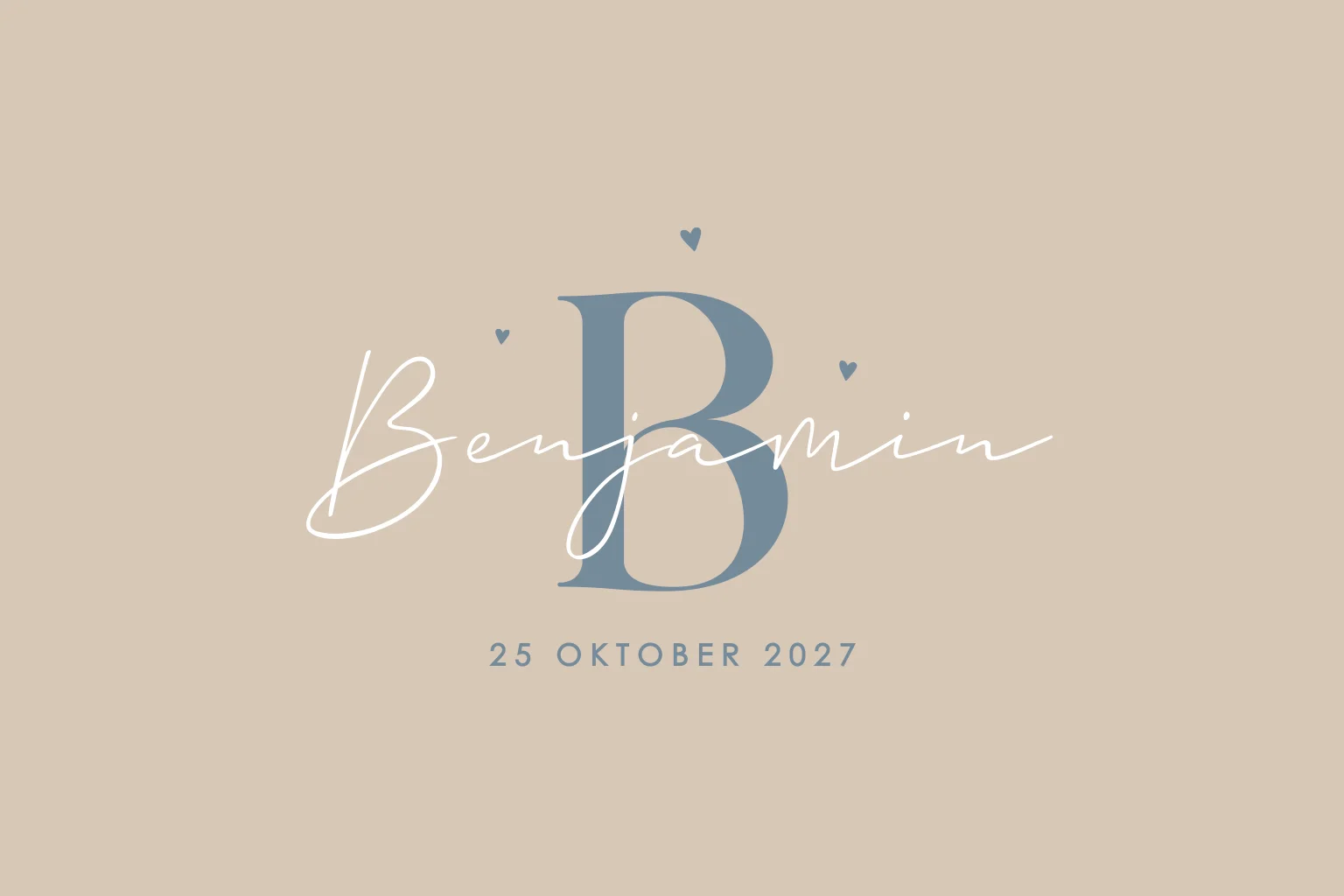 Eenvoudig geboortekaartje voor jullie zoontje met prachtige blauwe details. De achtergrond van het geboortekaartje heeft een neutrale kleur beige en het initiaal van de naam staat in denim blauw met kleine hartjes er omheen.