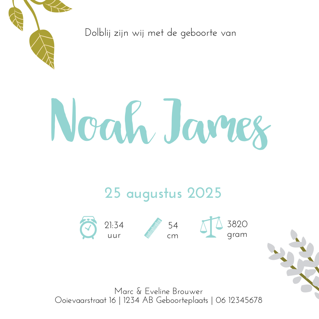 Een botanisch geboortekaartje met een frame van bladeren en takjes, wat leuk voor een jongen! De aquakleur geeft dit kaartje een frisse touch. Teksten en lettertypes kunnen in de online editor worden aangepast. Maak er helemaal je eigen kaartje van!