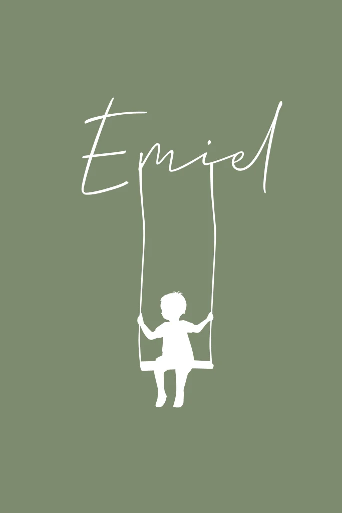 Een lief geboortekaartje voor de geboorte van jullie zoontje. Het kaartje heeft een silhouet van een jongetje op de schommel met daarboven sierlijke letters.