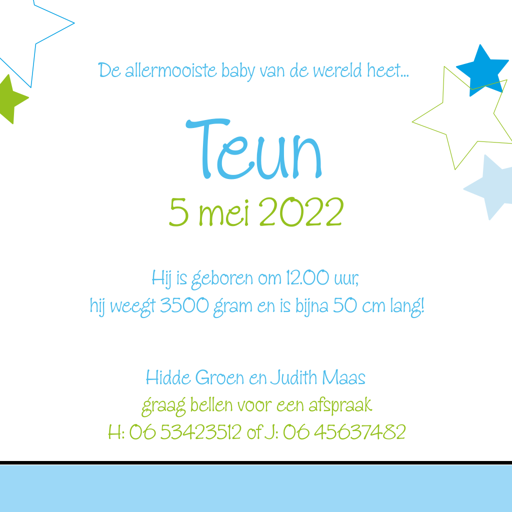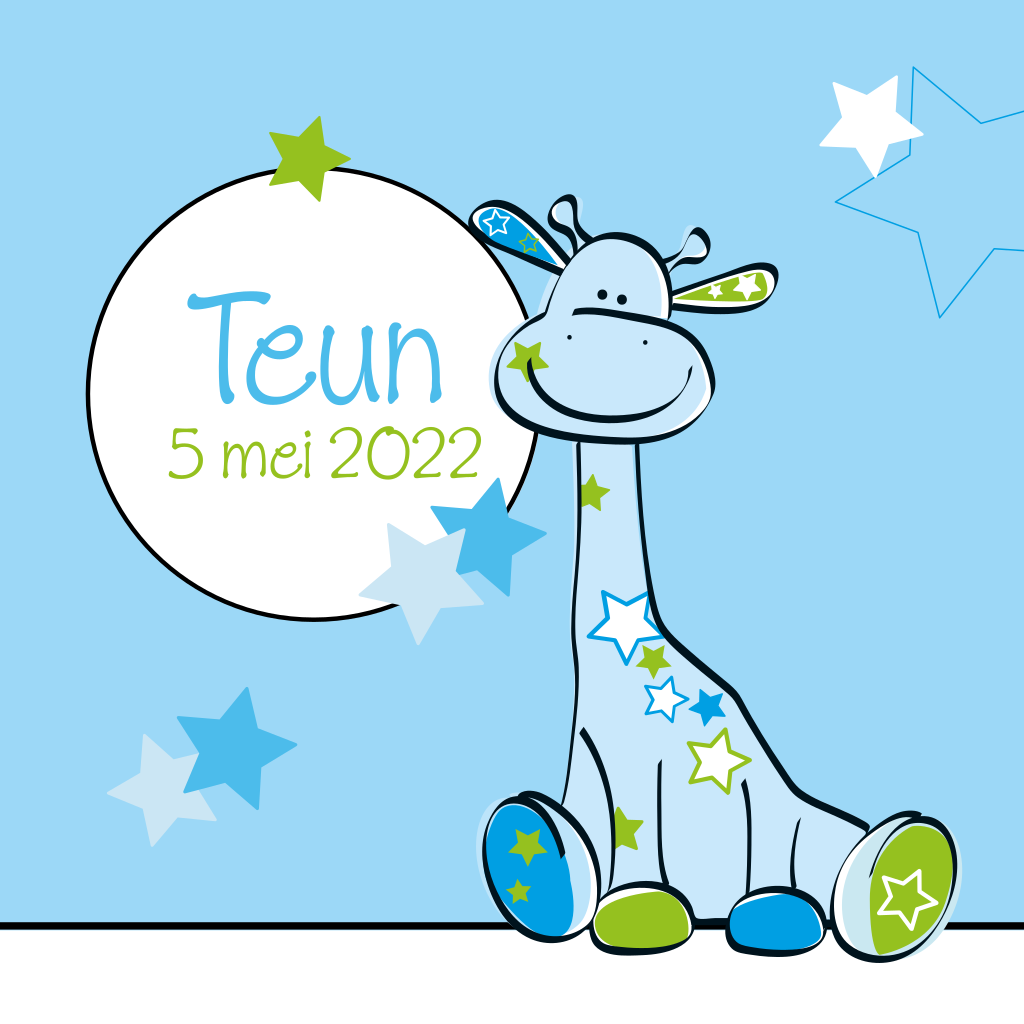Een hip geboortekaartje voor een jongen! Op de kaart staan heel veel sterren en op de voorkant een lieve giraffe. Aan de binnenkant van de kaart zie je dezelfde giraffe met twee kuikens en een speelgoedtreintje. Erg lief!