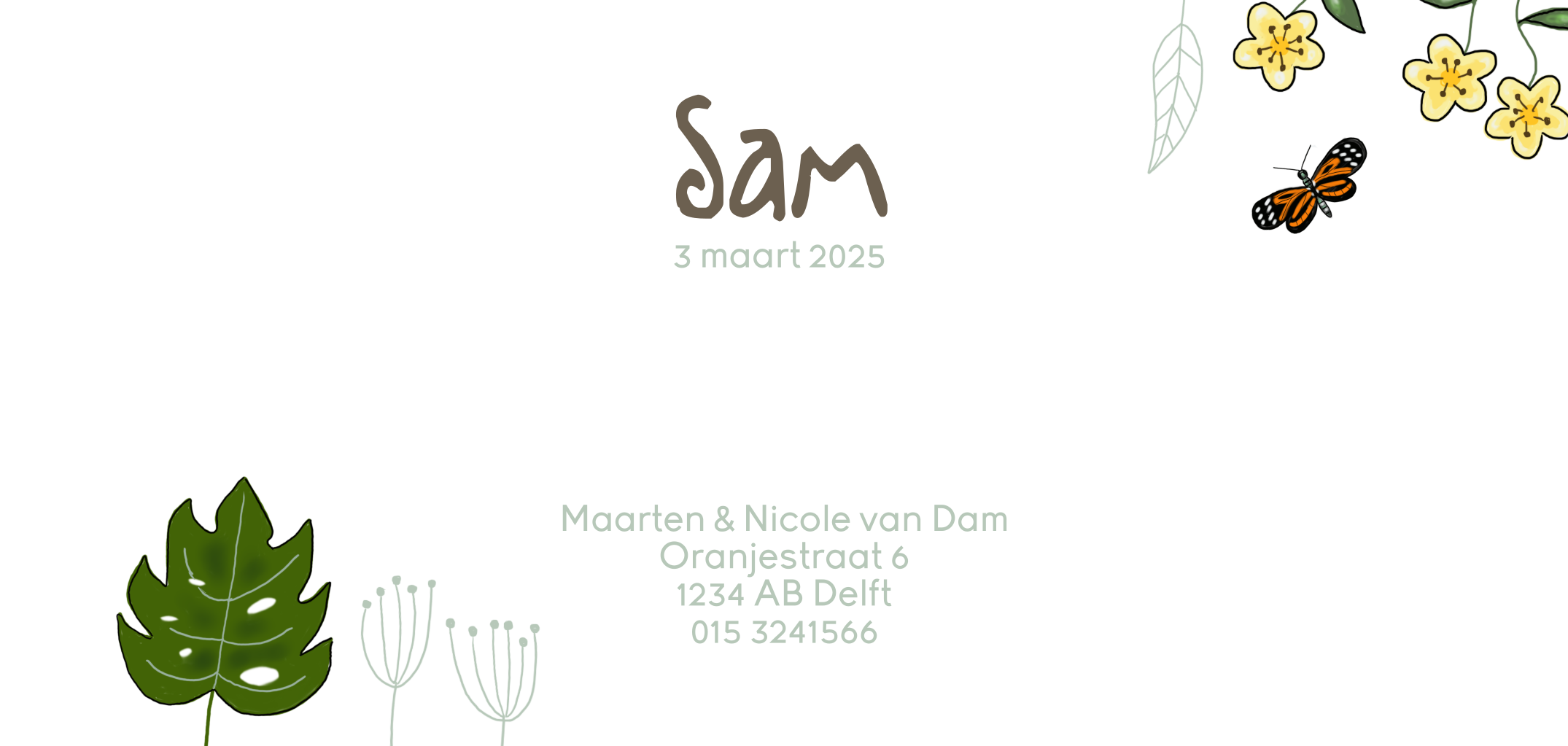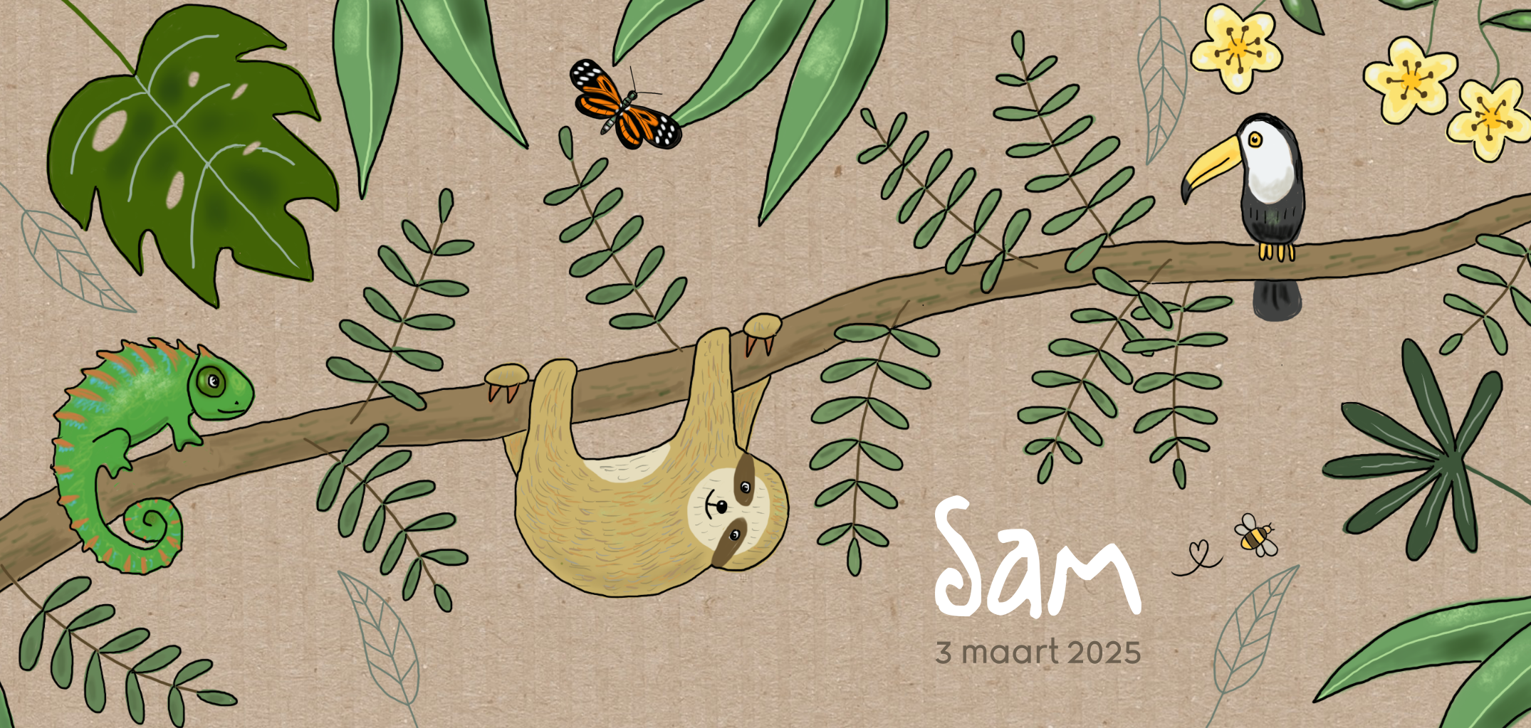 Een hip geboortekaartje voor een jongen of een meisje met luiaard, kameleon, toekan, vlinder, bij en heel veel planten op een kraft achtergrond.