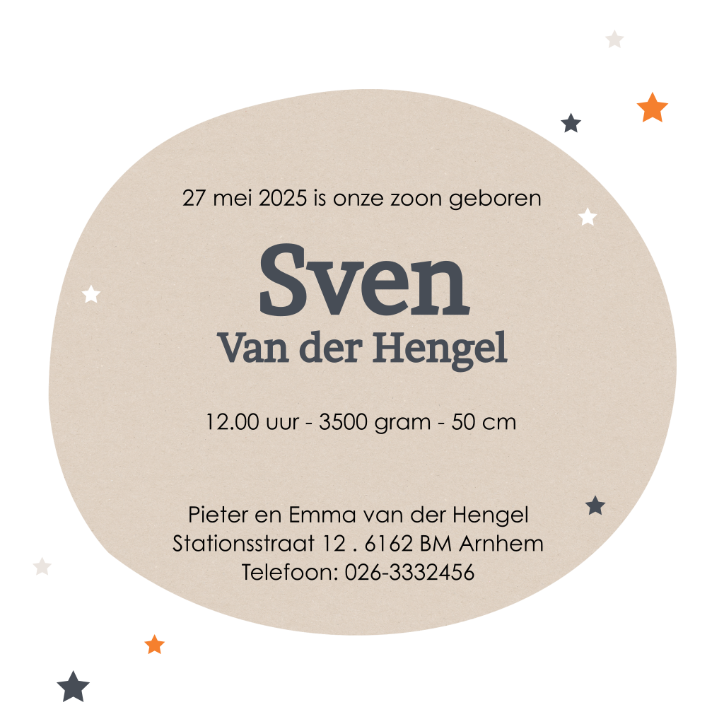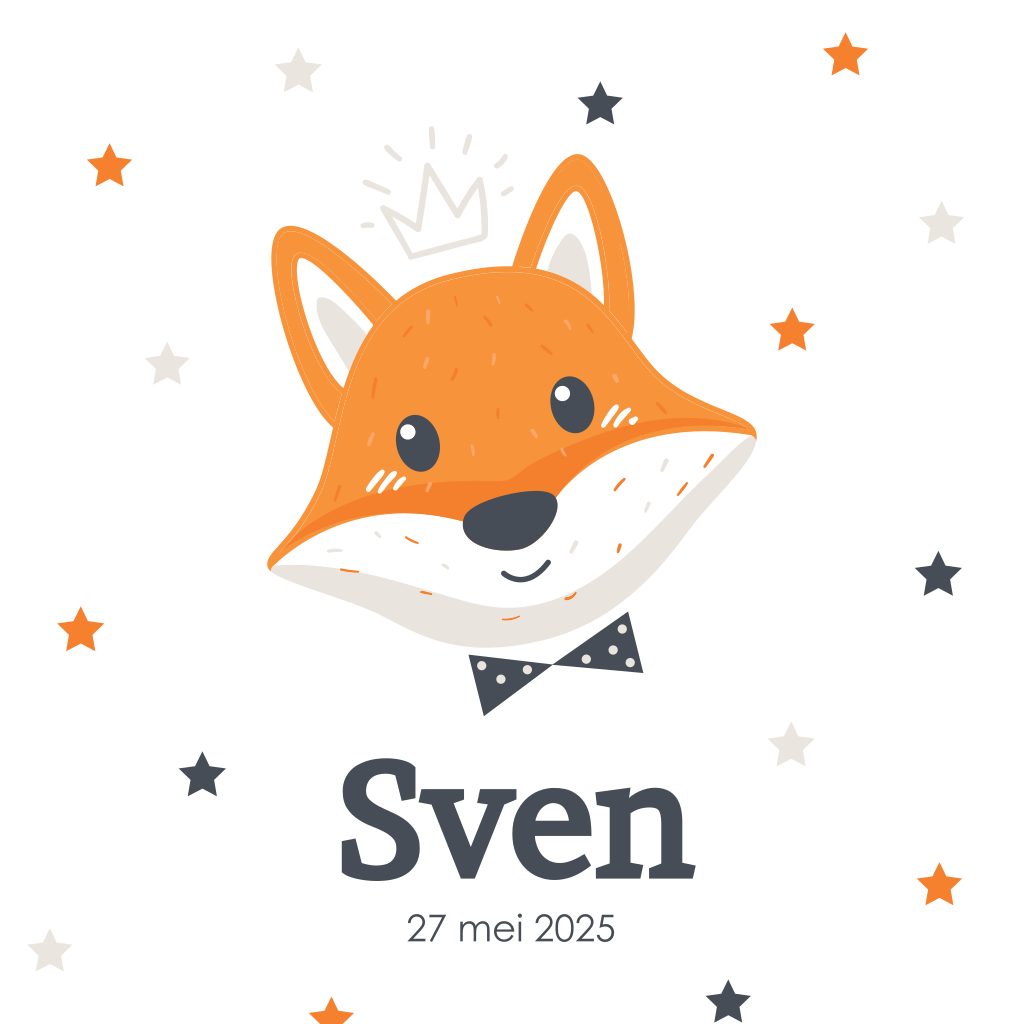 Een hip geboortekaartje met een vosje met een strikje en een kroontje. Leuk zijn ook de sterretjes op de achtergrond in verschillende kleuren. In onze online-editor kun je de kleuren en lettertypes ook naar wens aanpassen!