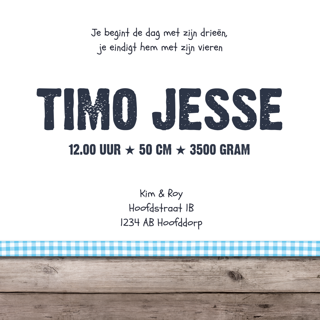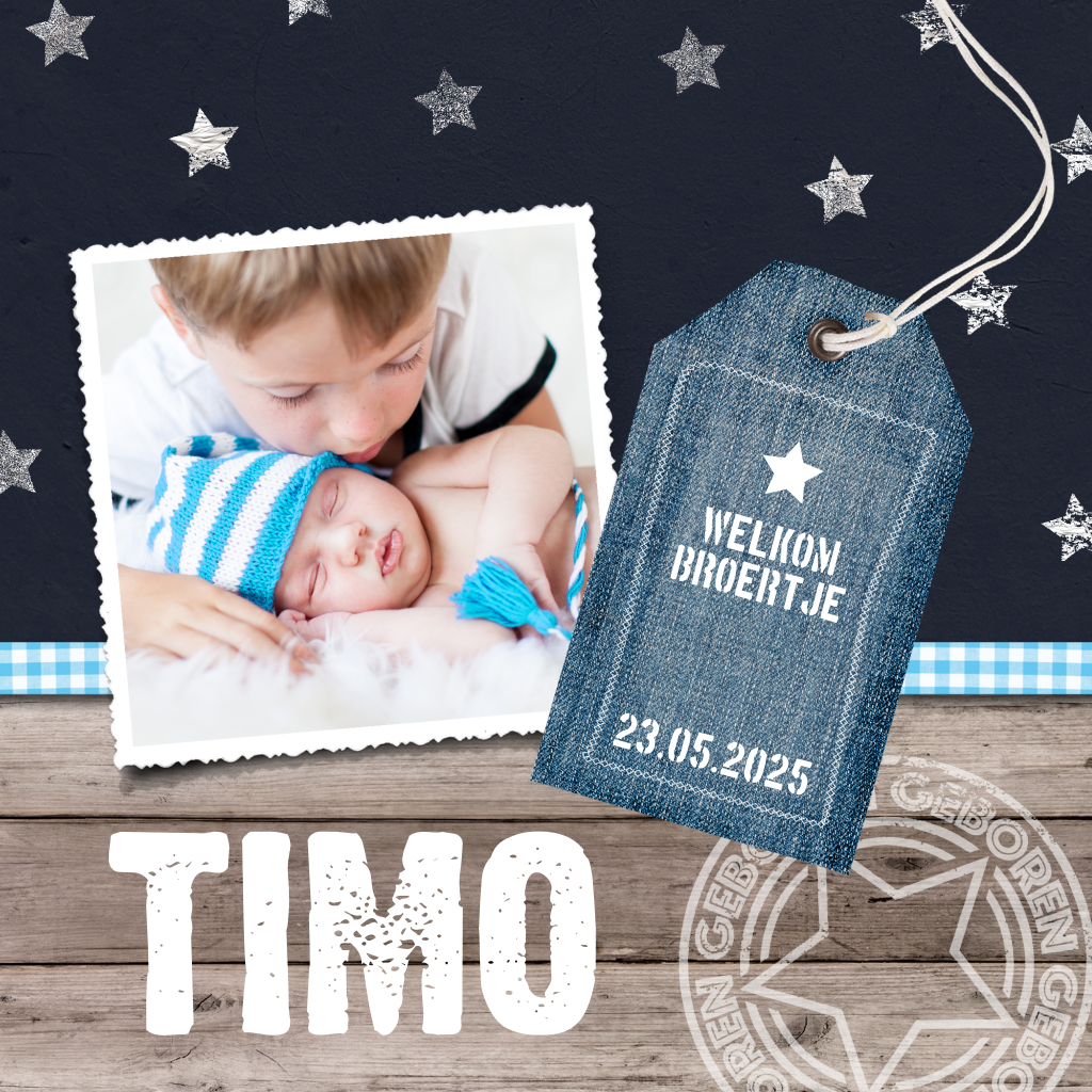 Geboortekaartje jongen met stoere look en feel. Het label van spijkerstof, de sterren, het hout en stempel maken dit kaartje uniek.
