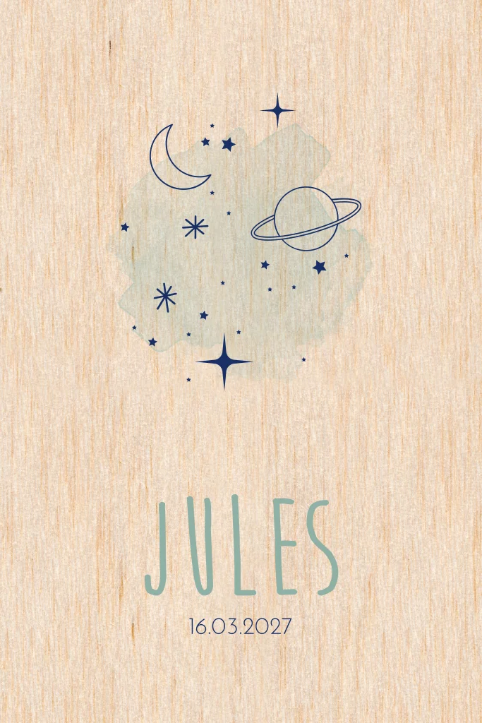 Houten geboortekaartje in heelalthema met sterrenhemel