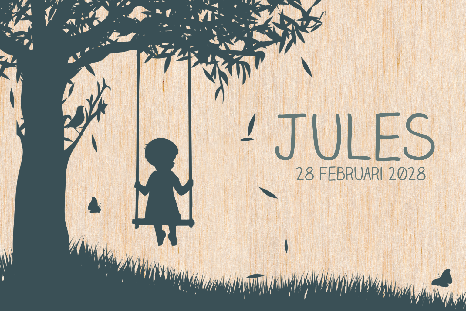Uniek geboortekaartje van echt hout met een mooi silhouet van een landschap en een kind op een schommel. Het hippe lettertype maakt de kaart helemaal trendy. In de online editor is het ontwerp eenvoudig naar eigen wens aan te passen.