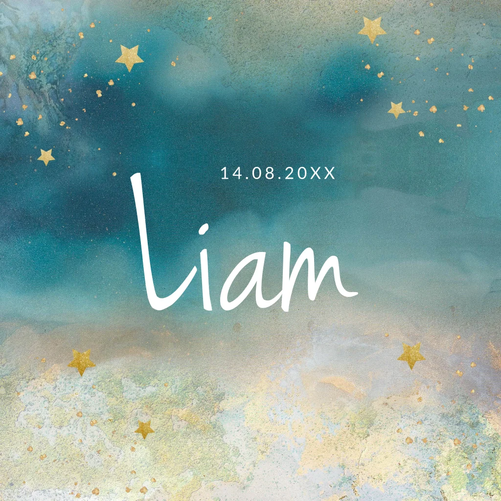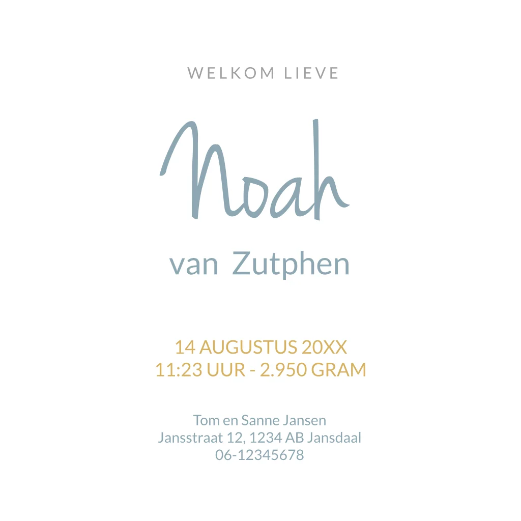 Geboortekaartje voor jongen met aquarel en goudaccenten. Verander het lettertype om je eigen stijl te creëren.