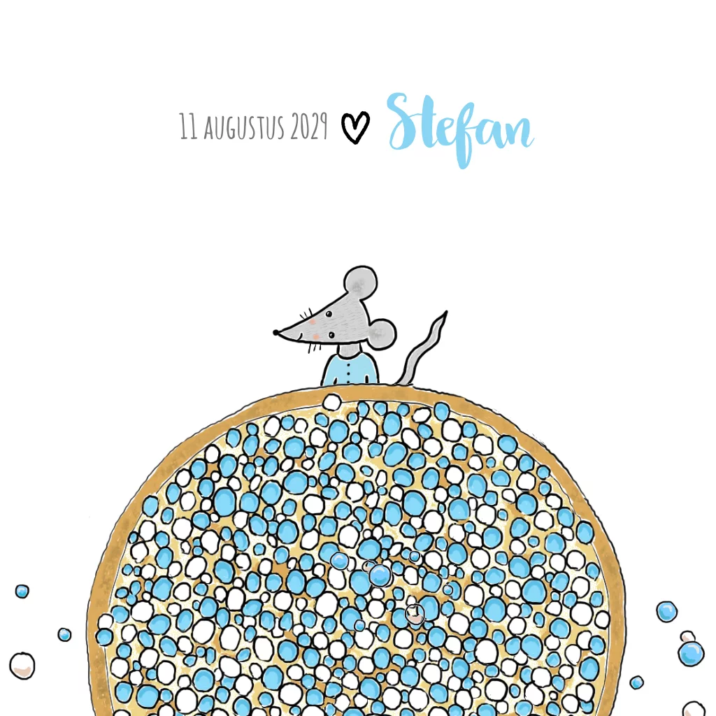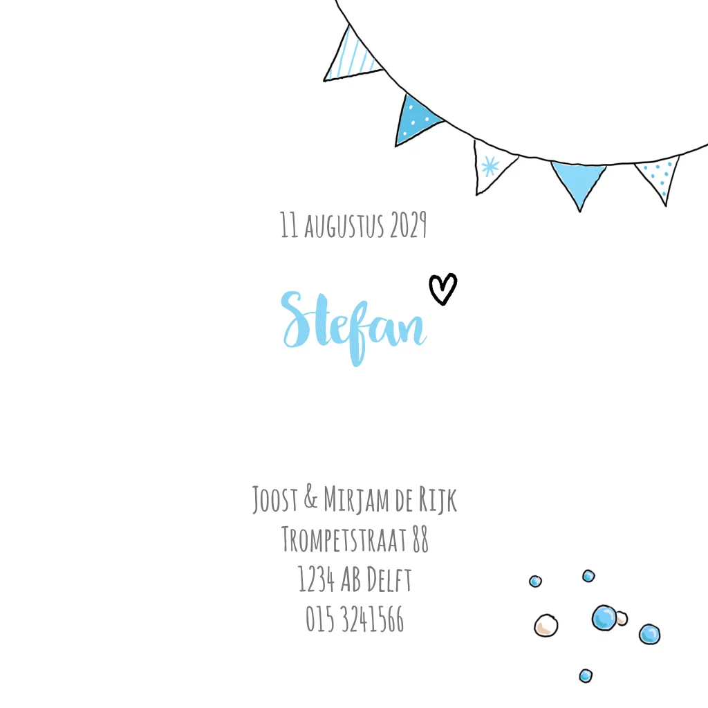 Een vrolijk geboortekaartje met beschuit met muisjes voor een jongen. Door de slingers is deze kaart heel feestelijk!
