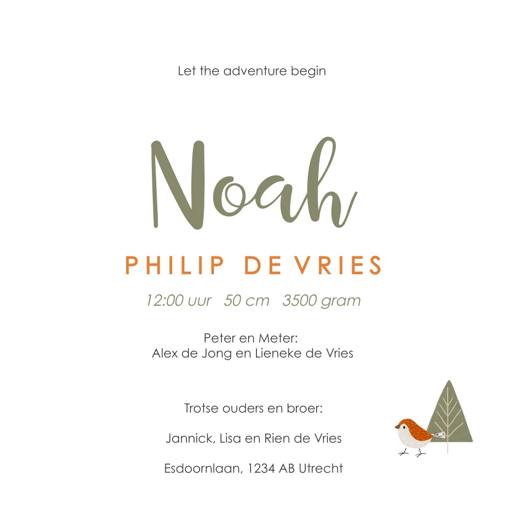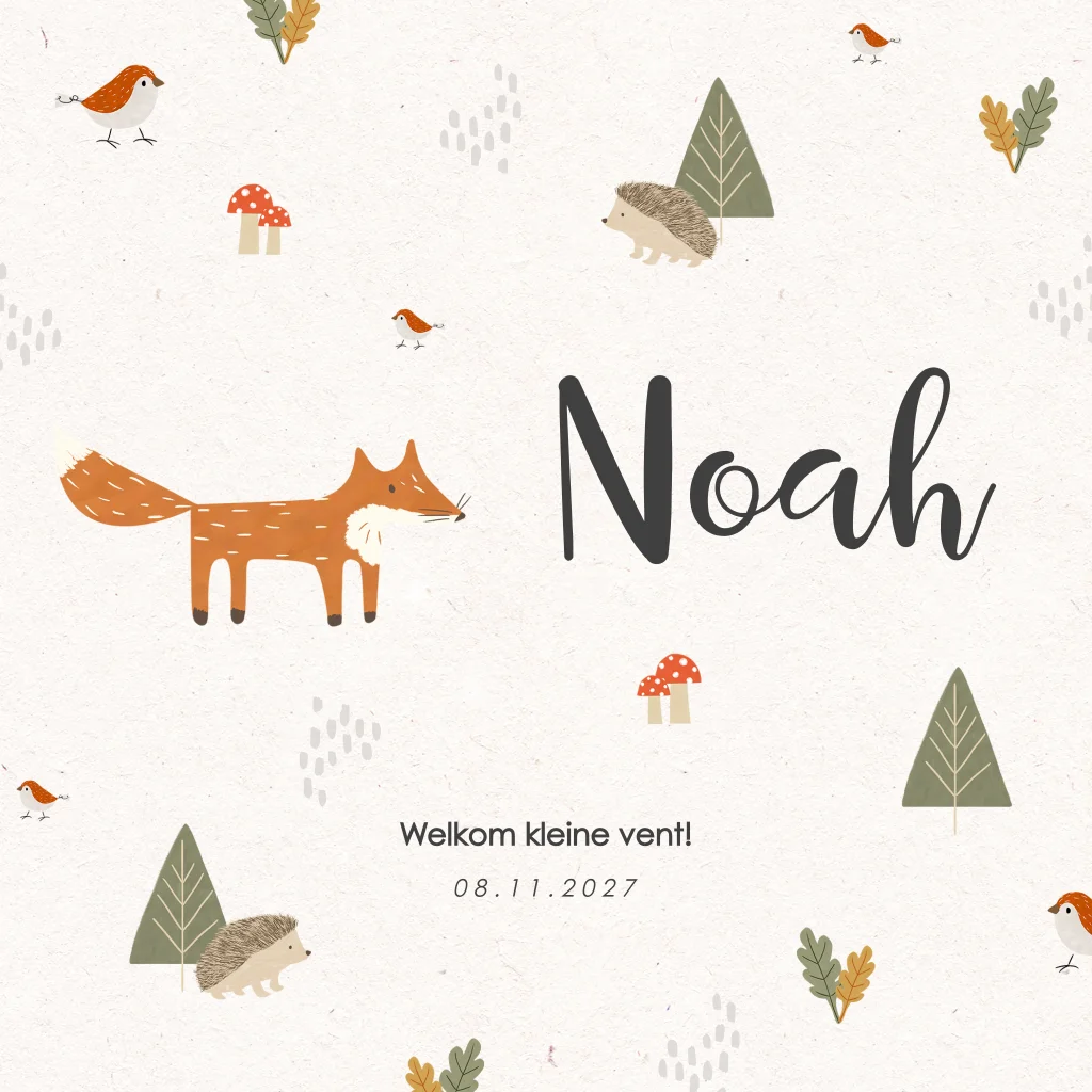 Trendy, dit hippe geboortekaartje voor een zoontje! Op het beige kaartje staan leuke illustraties van bosdieren tussen de bomen, paddenstoelen en blaadjes. De illustratie van het vosje, de egel en het vogeltje staan ook aan de binnen- en achterkant. Aan de binnenzijde kun je een foto plaatsen van jullie zoontje.