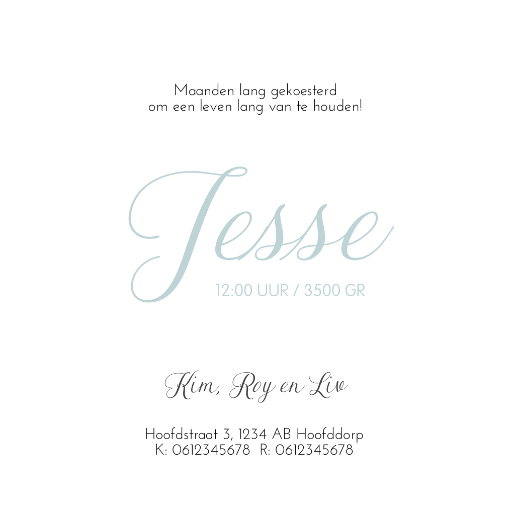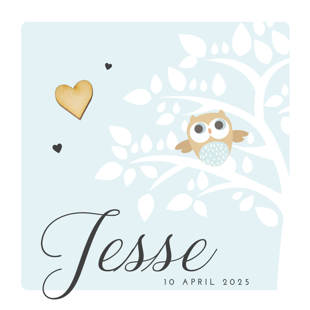 Romantisch geboortekaartje voor een jongen met zacht blauwe achtergrond en silhouet van een boom met daarin een uiltje. Het hartje op dit kaartje is een echte houten hartje die je er zelf op kunt plakken. Plaats aan de binnenzijde een mooie foto van jullie kleine man!