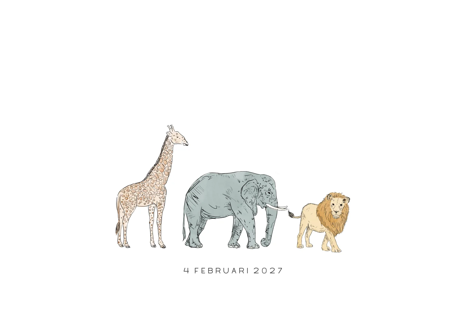 Geboortekaartje jongen met giraffe, olifant en leeuw