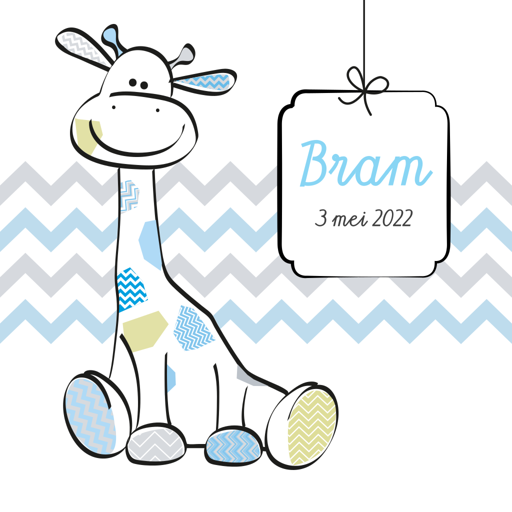 Dit hippe geboortekaartje is helemaal compleet met het moderne achtergrondpatroon, de blije giraffe met groene en blauwe vlekken en het naamlabel. Leuk voor een zoontje!