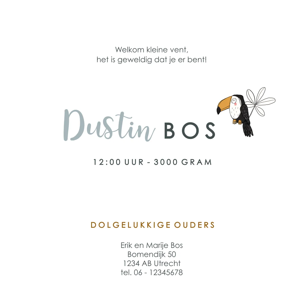 Superstoer, dit geboortekaartje voor jullie kleine man in junglethema! Op het lichtgrijze kaartje staan tijgers en toekans tussen de palmbladeren. De dierenillustraties komen ook terug aan de grijswitte binnenzijde en op de achterkant van het kaartje.